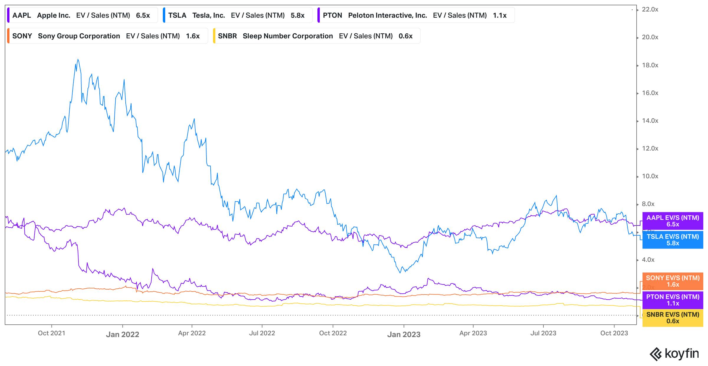 As a proxy, Apple, Tesla, Peloton, Sleep Number Corp, and Sony are comparable consumer technology companies that are publicly traded and sell hardware. The chart below demonstrates that valuations have come down for those companies since the time of Eight Sleep’s August 2021 raise, indicating that the current valuation of the company is likely lower than it was at the time of its Series C.