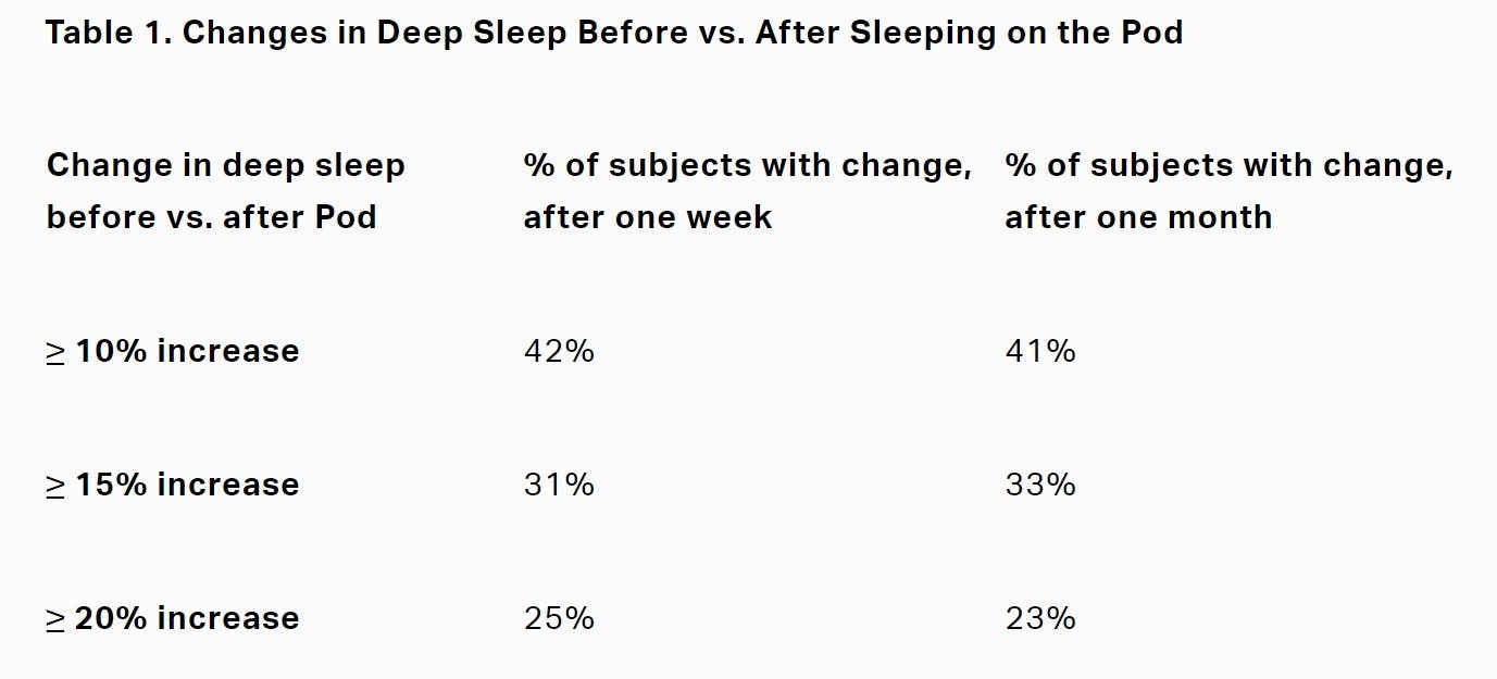 Furthermore, in a separate study, Eight Sleep found that subjects experienced a 10% or greater increase in deep sleep after one week of sleeping on the pod.