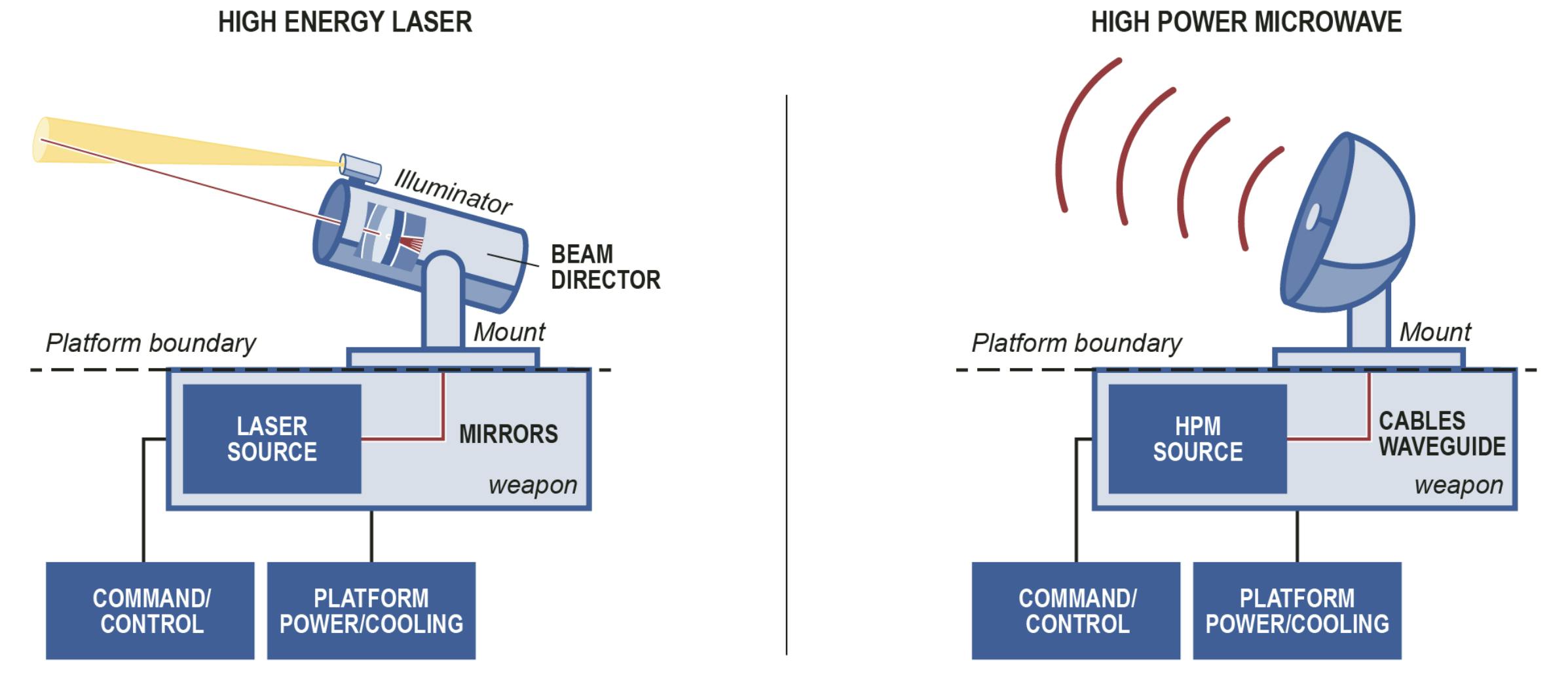 In contrast, HPM systems offer instantaneous effects over broader areas and are less affected by environmental factors. HPM pulses can penetrate non-conductive materials, allowing them to impact targets even behind obstacles. The DoD recognizes the potential of both technologies and has initiatives to develop lasers with power levels up to 1K kW to counter more significant threats such as cruise missiles. Various military branches are integrating HEL systems into their platforms, including the Army's 300 kW HEL for counter-UAS strategies, the Navy's 150 kW ship-based lasers for short-range defense, and the Air Force's prototypes for airborne and ground applications.