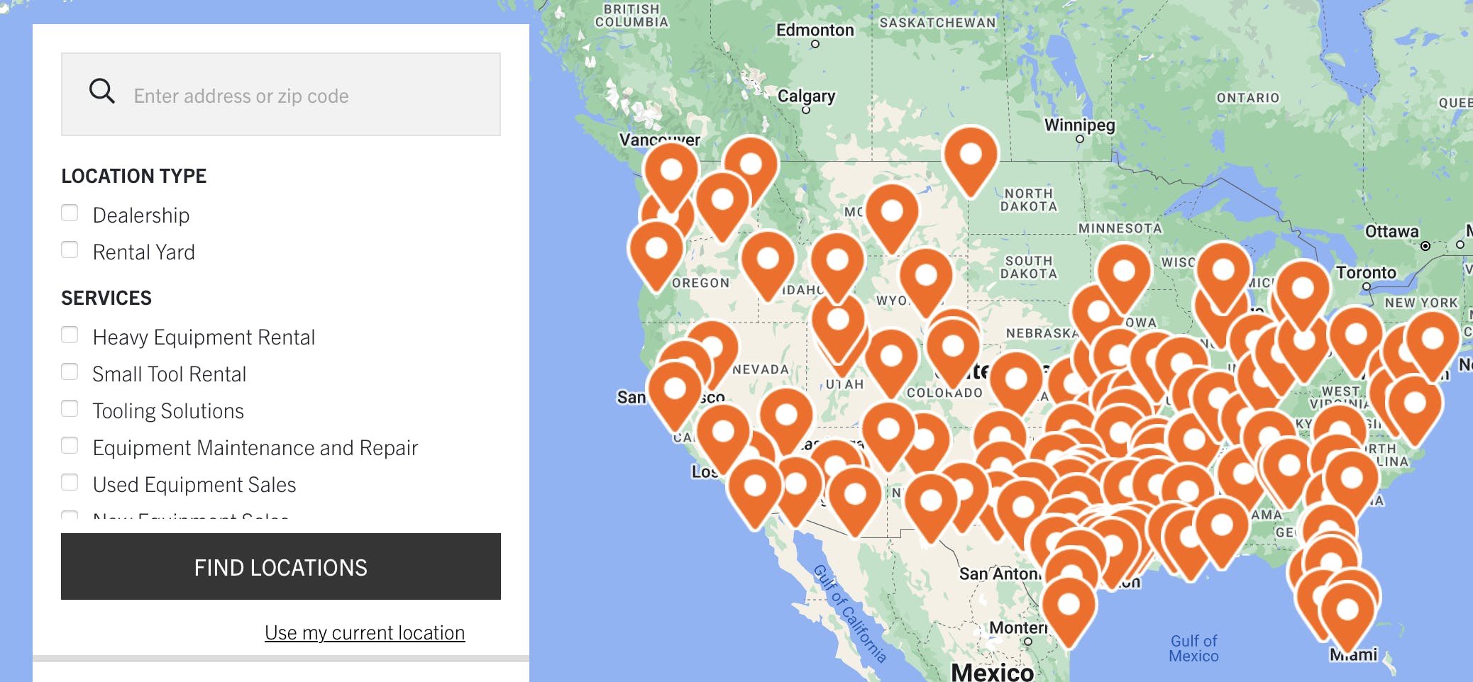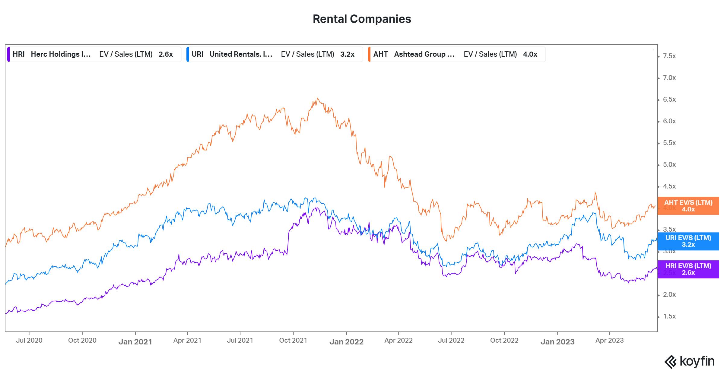 Herc Rentals: Herc Rentals, founded in 1965, is a large equipment rental company with approximately 5.6K employees and 312 company-operated locations, primarily in the US and Canada. It serves various customers in sectors such as construction, industrial manufacturing, refining, transportation, and agricultural production. Herc Rentals offers a diverse range of equipment for rent. In addition to rentals, the company provides a fleet management system and a telematics platform. Herc Rentals is publicly traded as Herc Holdings (HRI), with a market cap of $3.6 billion as of June 2023. In 2022, the company reported revenues of $2.7 billion.
