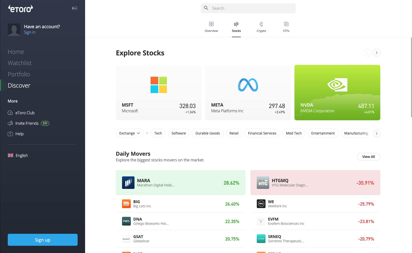 Robinhood served 23 million customers in the US alone in 2022. Robinhood’s smaller but concentrated user base generated $1.4 billion in revenue in 2022. eToro has a greater minimum deposit requirement of $10 but grants users a larger $10 asset gift and offers mock portfolios with $100K in test balance. Robinhood does not feature the same onboarding perks or public portfolios but features what might be seen as a cleaner user interface. Robinhood went public in 2021 and had a market cap of $11.3 billion as of December 2023.