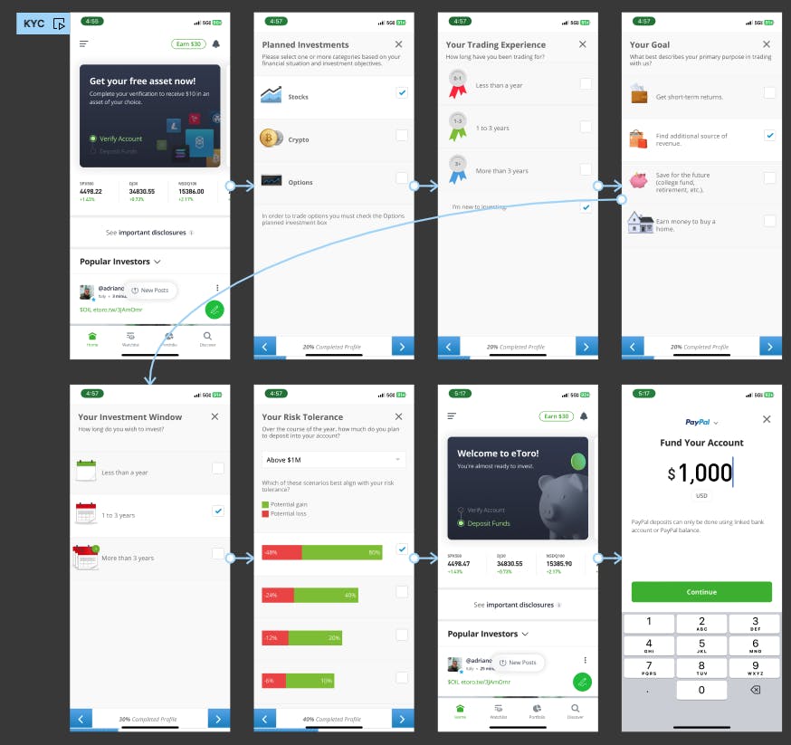 Once the KYC form is completed, eToro prompts the user to make a deposit. The app sets a default deposit amount of $1K, with PayPal as the suggested payment method. Unlike many investment providers that typically restrict funding to official bank accounts or debit cards, eToro offers more flexibility. It allows users to fund their investment accounts using partial payment services like PayPal and even borrowed funds, such as those from credit cards. This feature of eToro is intended to broaden the accessibility of its platform, catering to a diverse range of users with varying financial capabilities and preferences.