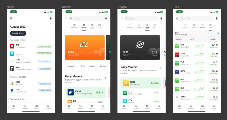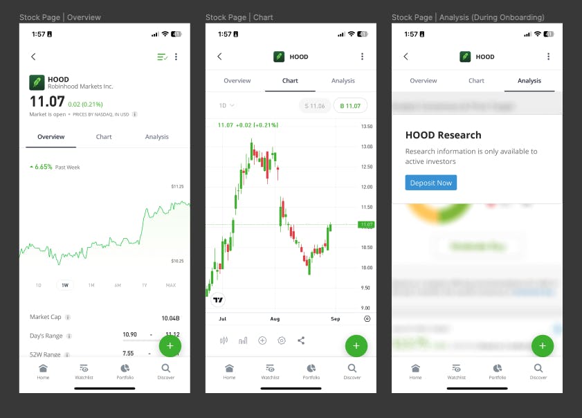When a user’s account is under review, the user can switch to a virtual portfolio or view the main home page, which includes a CTA to deposit funds. Users can explore a prefilled watchlist, empty portfolio, and robust discovery page.