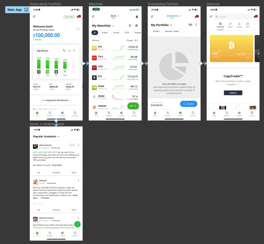 Home: In the virtual portfolio mode, users are greeted with preselected big market movers and standard market indices. While there is no direct option to deposit funds or purchase stocks from the home screen, selecting any of the big movers prompts the user to deposit funds. Scrolling down, users can view eToro’s disclosures and subsequently, a feed of investors. This setup allows users to familiarize themselves with market trends and eToro's community while their account is pending approval.