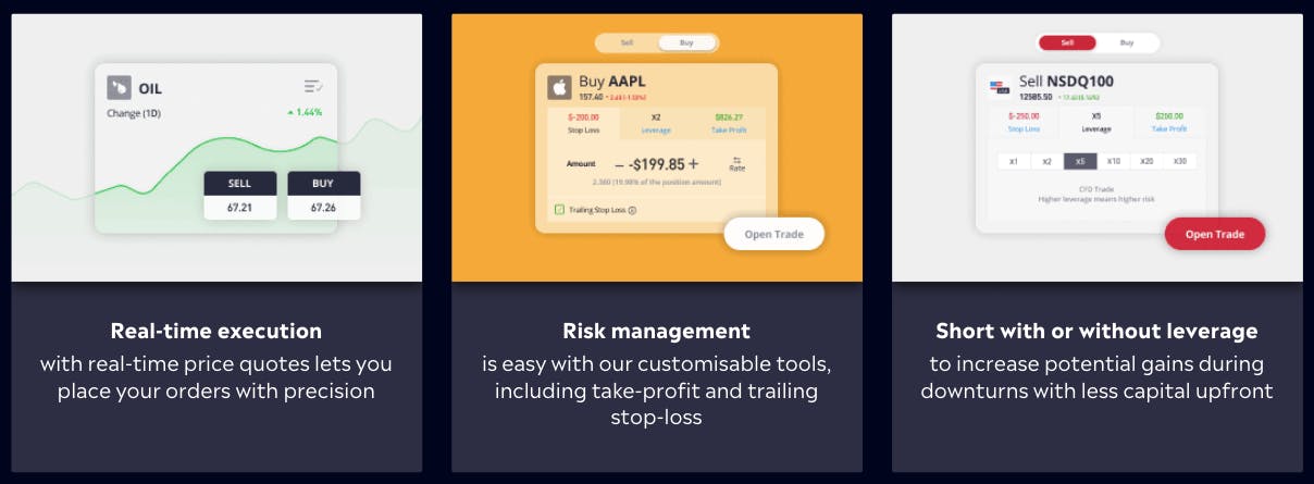 The interface for CFD trading on eToro is similar to its US stock and crypto trading interfaces but with a notable difference in the asset ordering modal. Unlike typical market buy or sell orders or standard limit orders, eToro's default window for CFD trading emphasizes purchasing based on leverage amounts. Following this, users are prompted to set stop-loss and take-profit levels for their trades. eToro advertises real-time execution for CFD trades, along with features for risk management and the ability to short-sell.