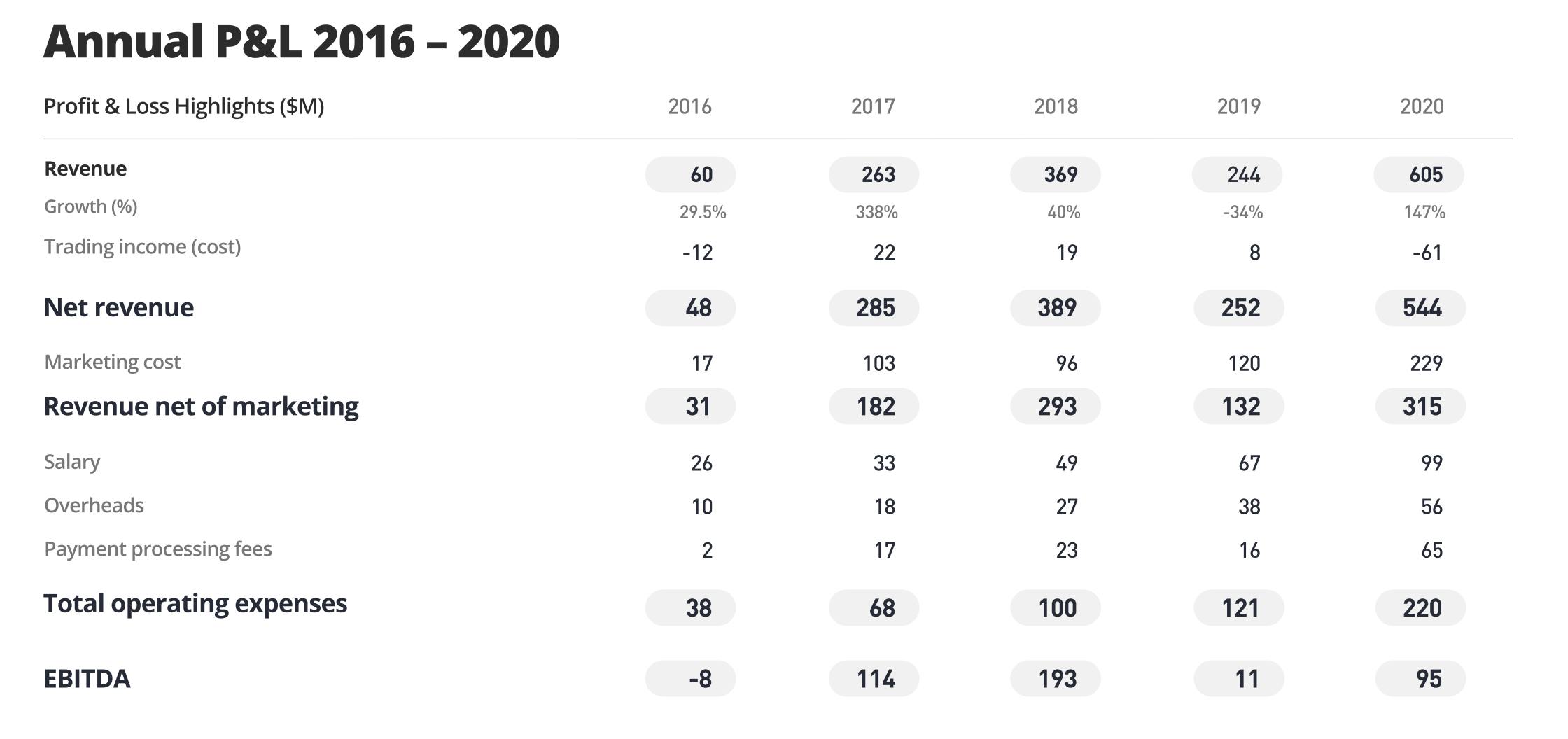The peak of eToro's EBITDA coincided with the 2017 crypto rally, leading to significant growth and revenue carryover into 2018. However, a market correction in 2019 resulted in a 34% decrease in revenue. In anticipation of the SPAC — and to recover from 2019 — eToro nearly doubled its ad spend from $120 million to $229 million in 2020.