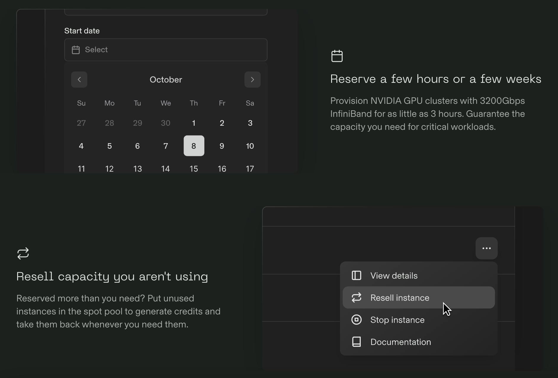 Reserved instances: Reserved instances for Foundry refer to compute resources that users can pre-book for specific periods, ensuring dedicated access to GPUs for their AI workloads. Specific time blocks are marked down for the desired duration, ranging from three hours to two weeks in increments flexible starting from 1 hour. Dedicated virtual GPUs are allowed for utilization during these specific times.