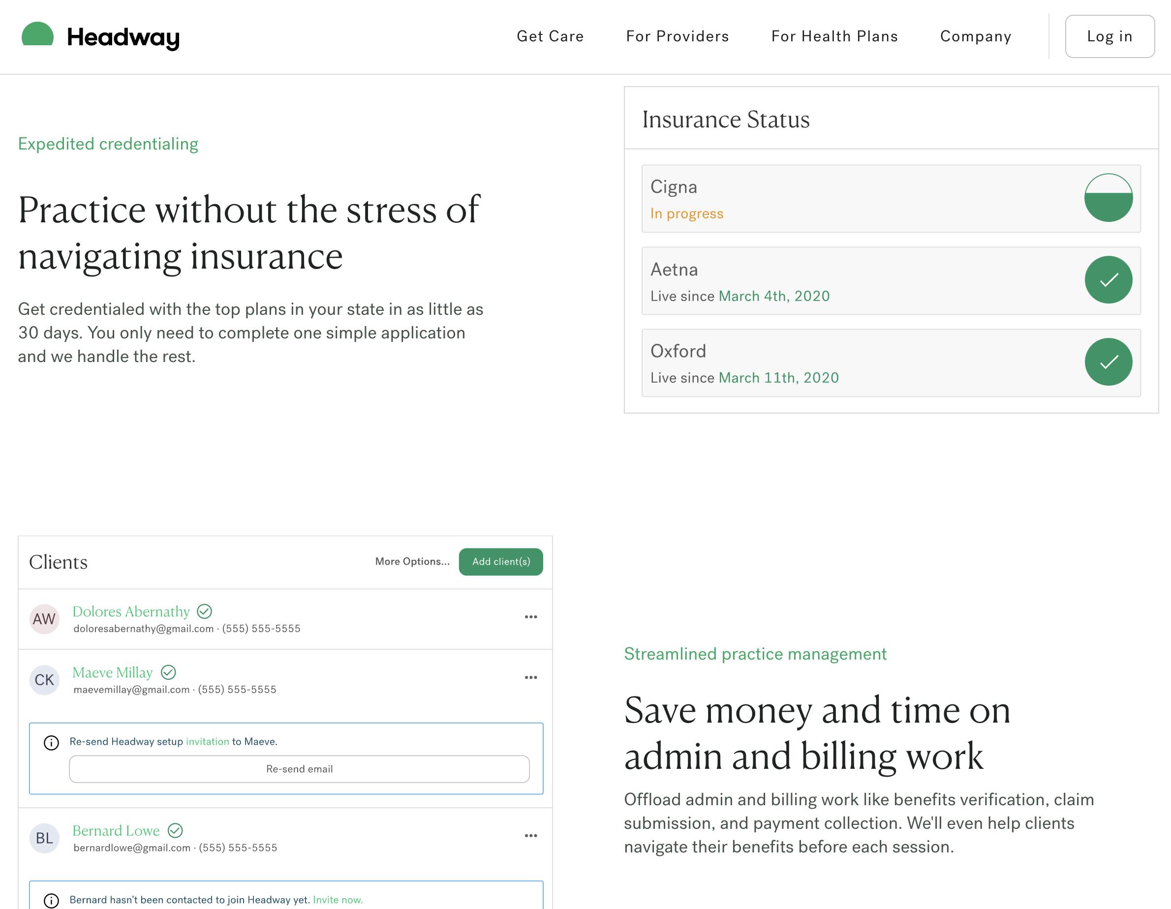 Headway takes care of the administrative burden of working with insurance companies so mental health providers can focus on helping their patients and growing their practices. Headway handles credentialing, claim submission, payments, benefits verification, client communications, and more on healthcare providers’ behalf.