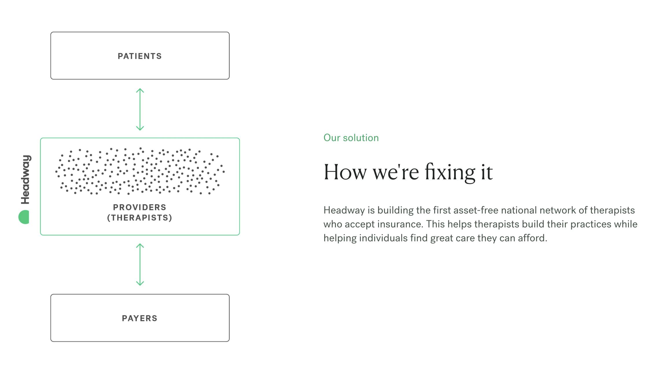 Headway has created a platform that connects patients, therapists, and insurance companies in the mental health ecosystem. Headway enables therapists to accept insurance coverage by offering claims management administrative support, payments, and scheduling. Headway improves the patient experience by allowing patients to search for therapists who best fit their needs, book appointments directly online, and get visibility into the costs they will be responsible for as part of their treatment. Insurance companies partner with Headway to increase access and quality for their health plan networks.