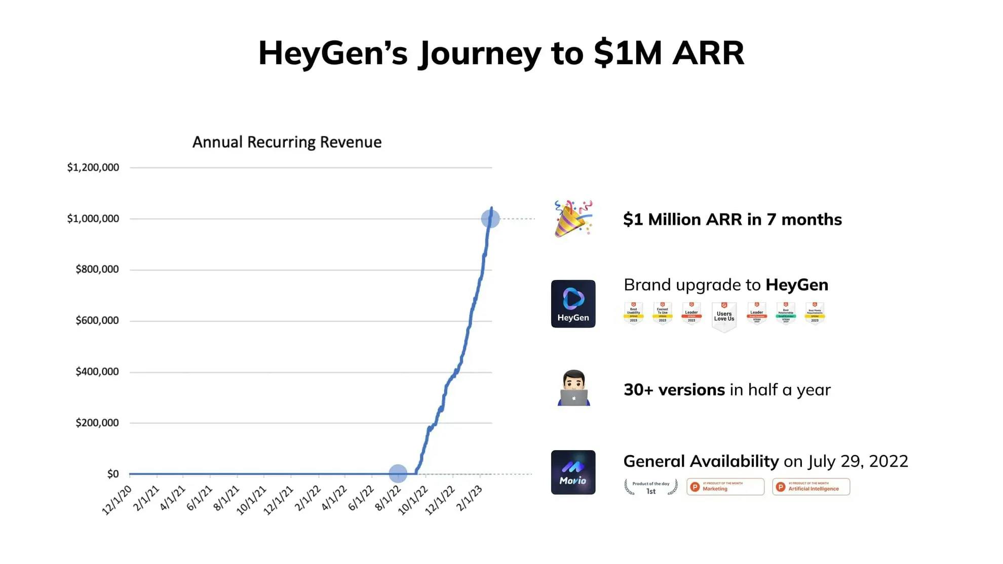 HeyGen took just 178 days to get to $1 million ARR. It launched its first video generation product in July 2022 under a freemium model with the caveat that there would be a relatively large watermark on videos. This approach was intended to spread awareness and acquire more users, and it worked. After launch, the company’s system crashed three times in the first few months as user-generated videos received millions of social media views. In March 2023, HeyGen reached $1 million ARR, before growing to $10 million in October 2023 and over $35 million in just over a year. As of May 2025, HeyGen has served over 85K customers globally and has been profitable since Q2 2023. To maintain momentum, the company has kept a weekly release schedule since its first product launch.