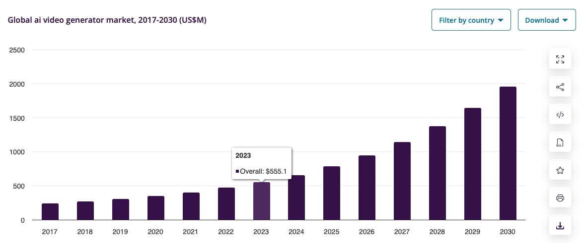 As demand for more and better quality videos increases from video consumers and creators, respectively, the global AI video generator market size is expected to grow to $1.9 billion by 2030. This growth may accelerate as AI-generated video becomes more commonly accepted. In November 2023, one investor pointed out that “we’re at 0.1% penetration of people even understanding this is possible, much less adopting it.”