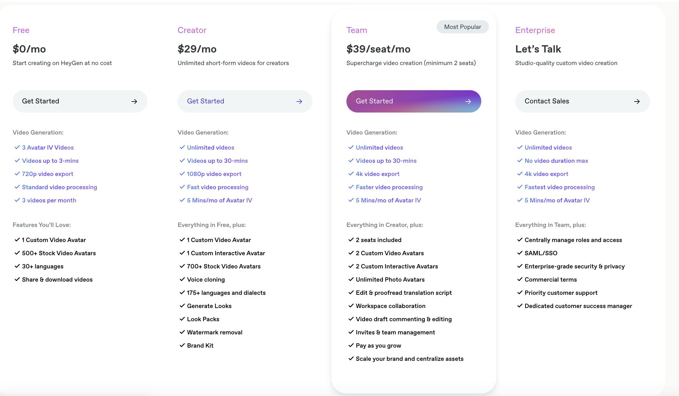 HeyGen offers a tiered pricing model for its web application. Users can choose a free plan that contains all the main functions but limits the videos that can be produced to three videos per month with a three-minute limit. Under this plan, users have access to up to five photo avatars, one customizable avatar, over 700 AI voices, and over 400 video templates. To unlock premium features, users can transition to paid plans. The Creator plan is $29 per month and allows users to create five-minute videos with a greater variety of photos and custom avatars. The next tier is a $39 per-seat-per-month Team plan, which offers videos with higher resolution and more advanced video editing capabilities. The final tier is a customizable Enterprise plan that provides fast processing speed and the opportunity to create unlimited videos with all available features.