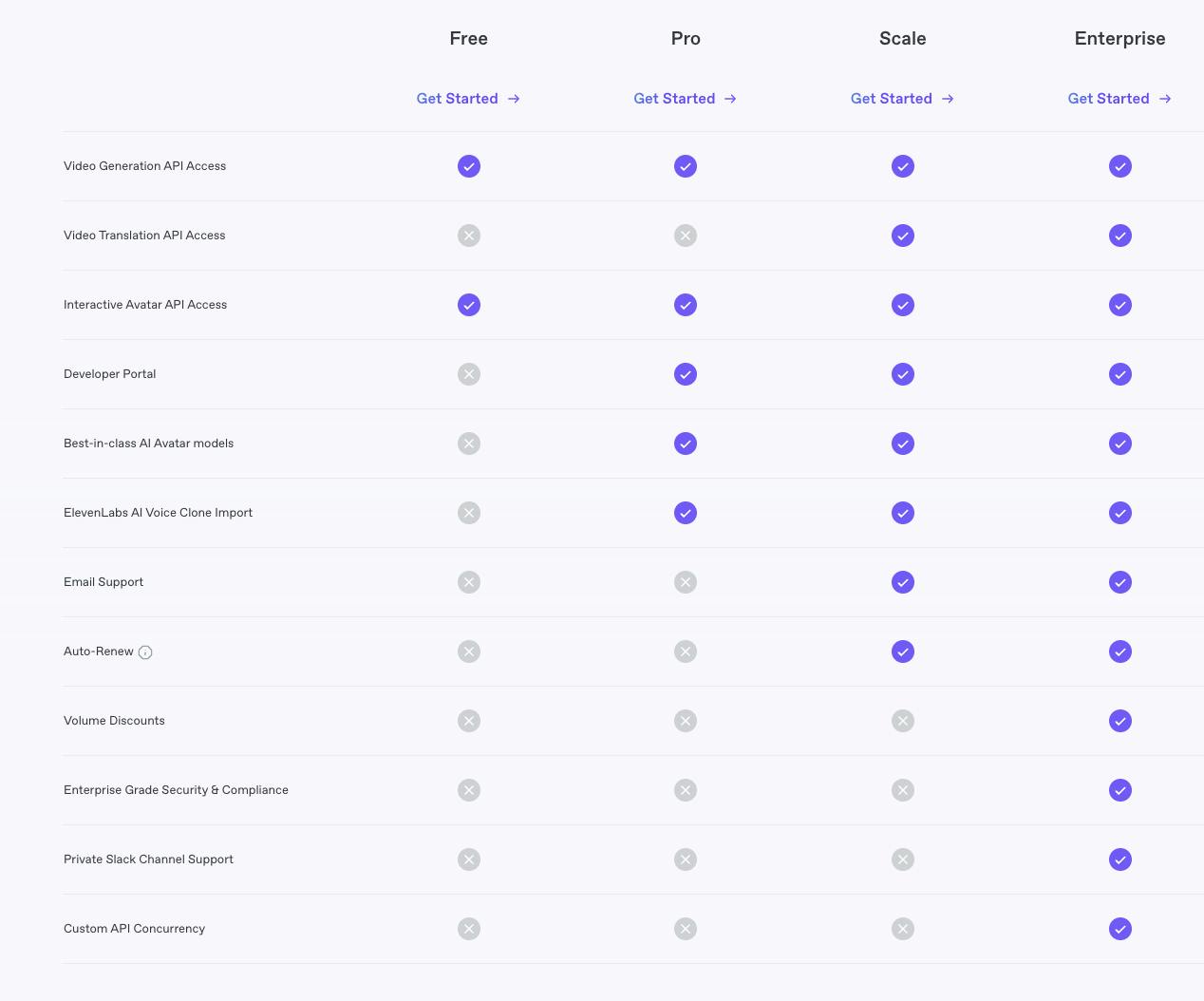For its APIs, HeyGen offers a tiered, credit-based pricing model where each video or animation consumes credits that must be used within a month of purchase. The free plan offers 10 free credits per month to use the video generation and interactive avatar APIs. The Pro plan offers 100 credits for $99 per month for longer videos with no watermarks. The Scale plan offers 660 credits for $330 per month for users to access the video translation API. Finally, the Enterprise plan is similarly customizable, enabling customers to negotiate a price to access the full API suite.