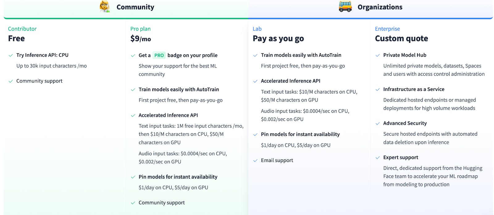 Their pro and lab plans allow users to train their first project for free, then pay $9/month (pro plan) or pay-as-you-go (lab plan). The pro plan limits access to their Inference API to 1M input characters per month and 2 hours of audio. The lab plan has no limits because users are paying for what they need to use. Enterprise customers get customized quotes for their Hugging Face usage, plus they have more support and security features than other plans.