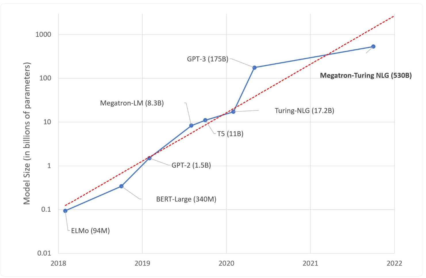 If the size of the NLP market is being driven by the growth of NLP model parameters, it could grow quicker than expected. From 2018 to 2021, the number of parameters making up notable NLP models increased from 340 million to 530 billion—demonstrating incredible growth.