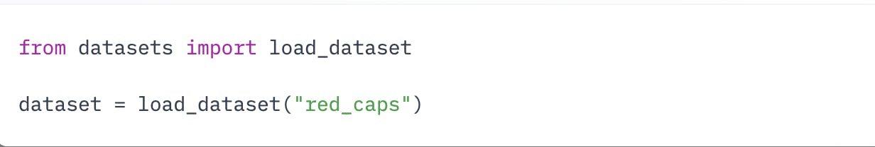 As of August 2022 the Datasets Library contains over 9,100 datasets. Users can access and interact with the Datasets Library using a few lines of code. For instance, it only takes 2 lines of code (see image below) to access RedCaps—a 12 million image-text dataset scraped from Reddit.