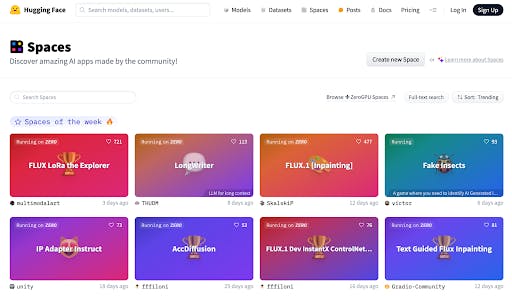 Hugging Face also provides a platform named Spaces for developers to build, host, and share their models with the machine learning community. Developers can use Spaces to help build their portfolios by sharing their NLP, computer vision, and audio models. Spaces support interactive demos (limited to 16GB RAM and 8 CPU cores) for hosted models and versioning control with a git-based workflow.