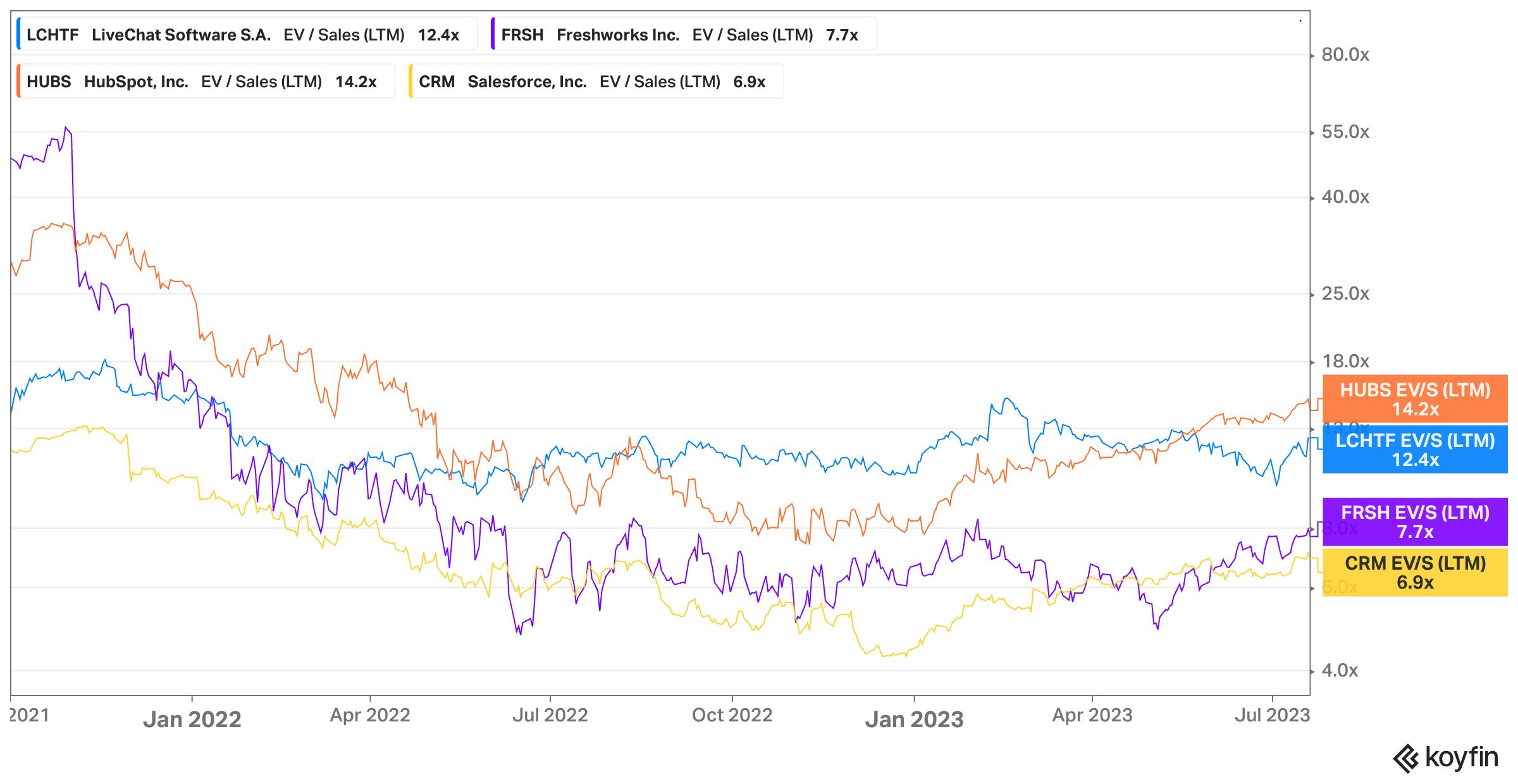 Similar publicly traded companies, like Salesforce, HubSpot, Freshworks, and LiveChat, trade at a range of multiples of LTM revenue from ~7x to ~14x. A close comparable company, like LiveChat, is trading at ~12.4x LTM revenues of $315 million, growing ~41% year-over-year. Intercom is estimated to have ended 2022 at $250 million of revenue, growing ~25% year-over-year. Given the lower growth rate, Intercom would likely trade as a public company at ~6-9x LTM revenue representing a current valuation of $1.5-2.3 billion.