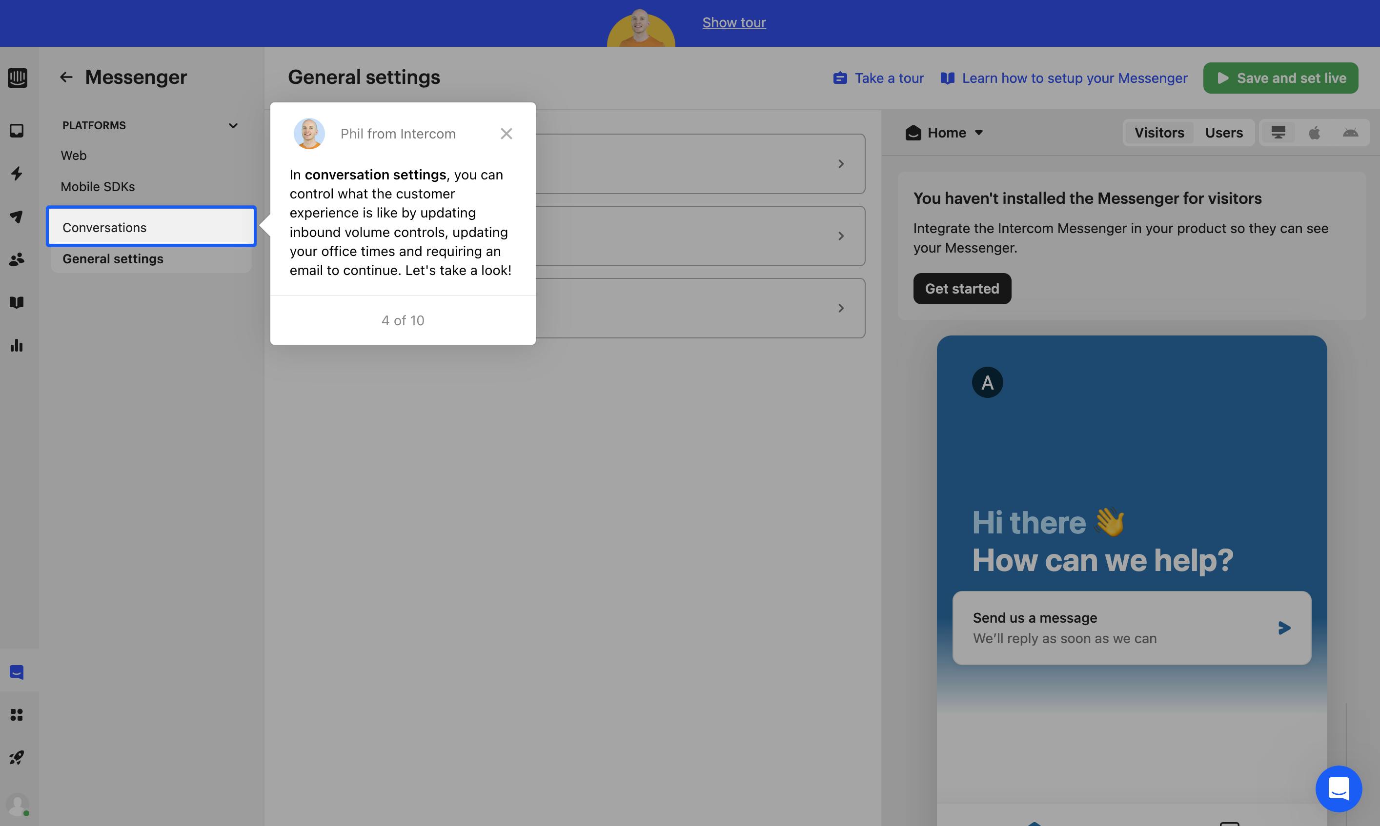 Product Tours: Intercom provides user guides to walk new users through an application, hopefully supporting a customer in their usage even before they have an issue. The product tour feature is a no-code workflow builder that offers event tracking and analytics to monitor usage. The product can highlight key features, embed videos of how-to guides, and wait for users to interact with input fields to complete the setup process. The feature is also optional for users who prefer to explore a product on their own.