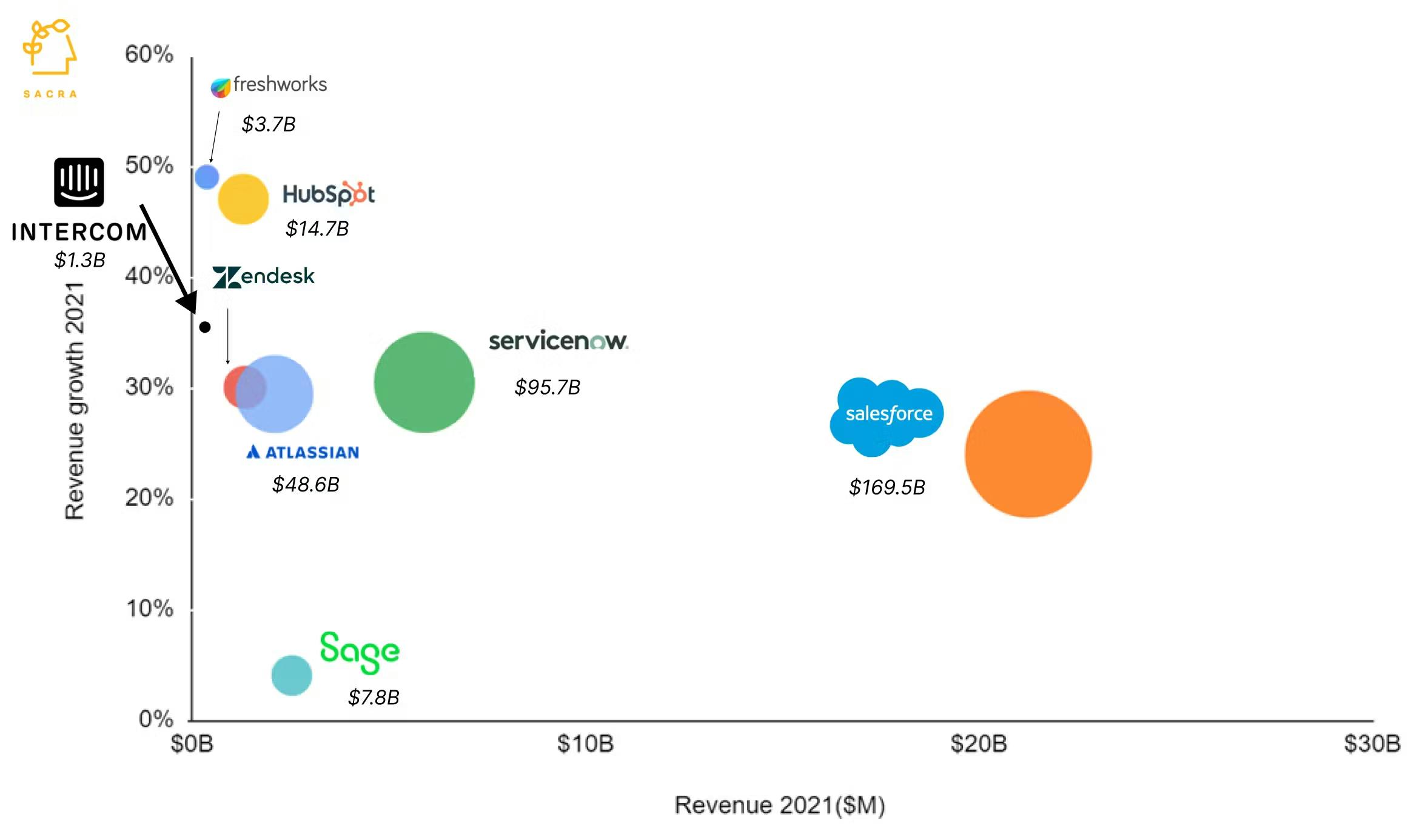 Intercom raised a $125 million Series D in March 2018 from Kleiner Perkins at a $1.3 billion valuation. In total, the company has raised $240 million of funding. Based on estimates of Intercom’s 2022 revenue at $250 million, the company’s $1.3 billion valuation would represent a 4.3x current revenue multiple. Zendesk, a service-first CRM company, was acquired in 2022 for $10 billion, representing a 6.6x revenue multiple.