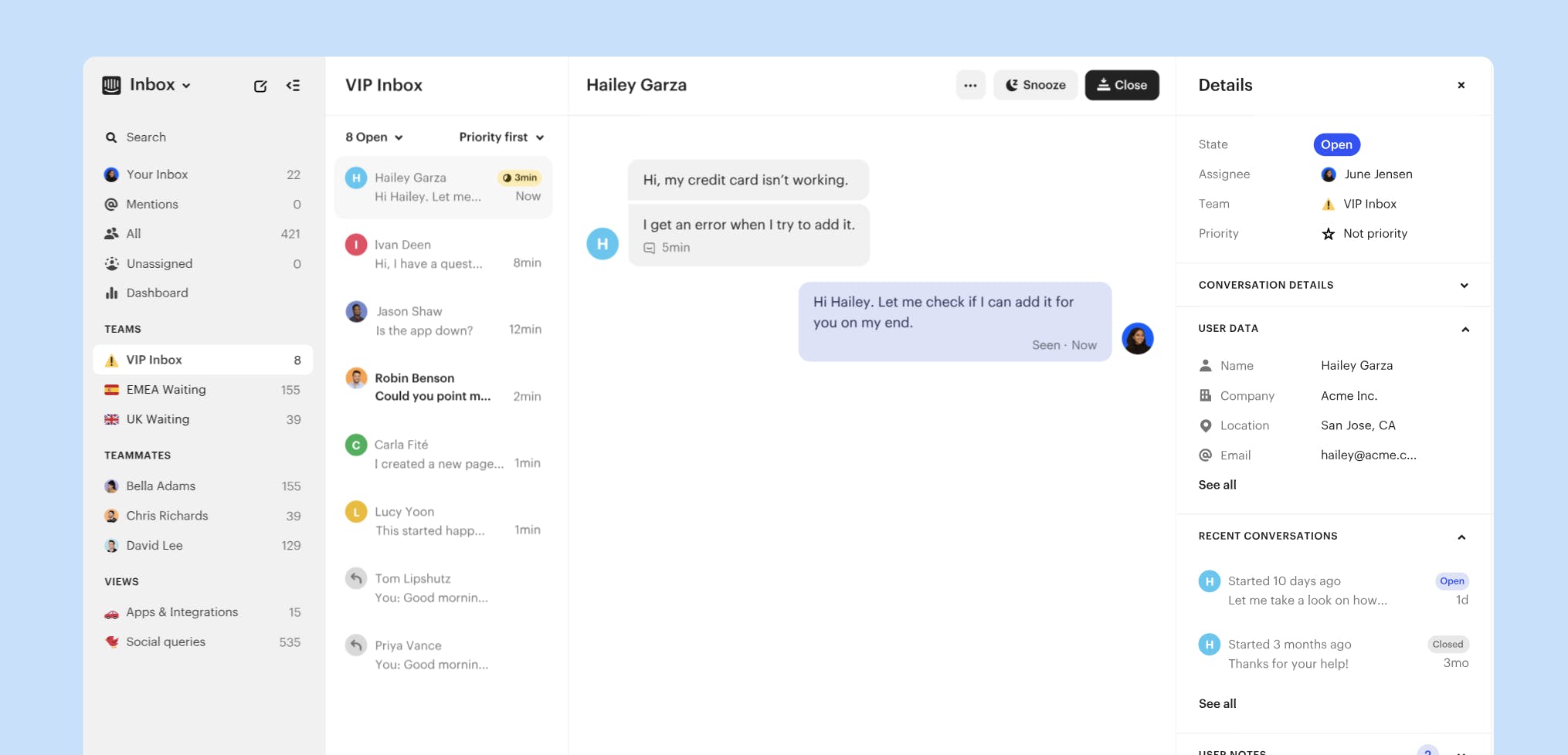 The Inbox connects to over 400 services like Jira, Salesforce, Stripe, or Slack, allowing the team to create engineering tickets and take action without leaving Intercom. Other features include trigger-based personalized responses, service-level agreements (SLA) to prioritize urgent conversations and high-priority customers, routing automation to automate manual tasks, and workload management to achieve quick response times.