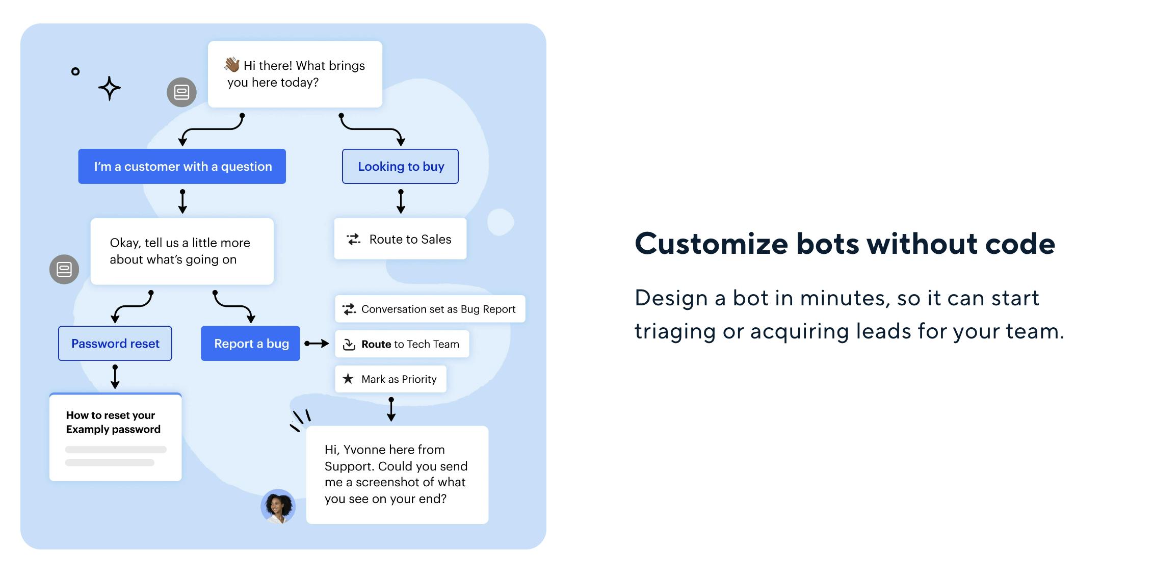 No Code Automated Bots: Intercom’s custom bots are designed to sort conversations, engage leads, and direct customers to help center articles automatically. They function as interactive forms with buttons to collect upfront information and identify a user’s intent.
