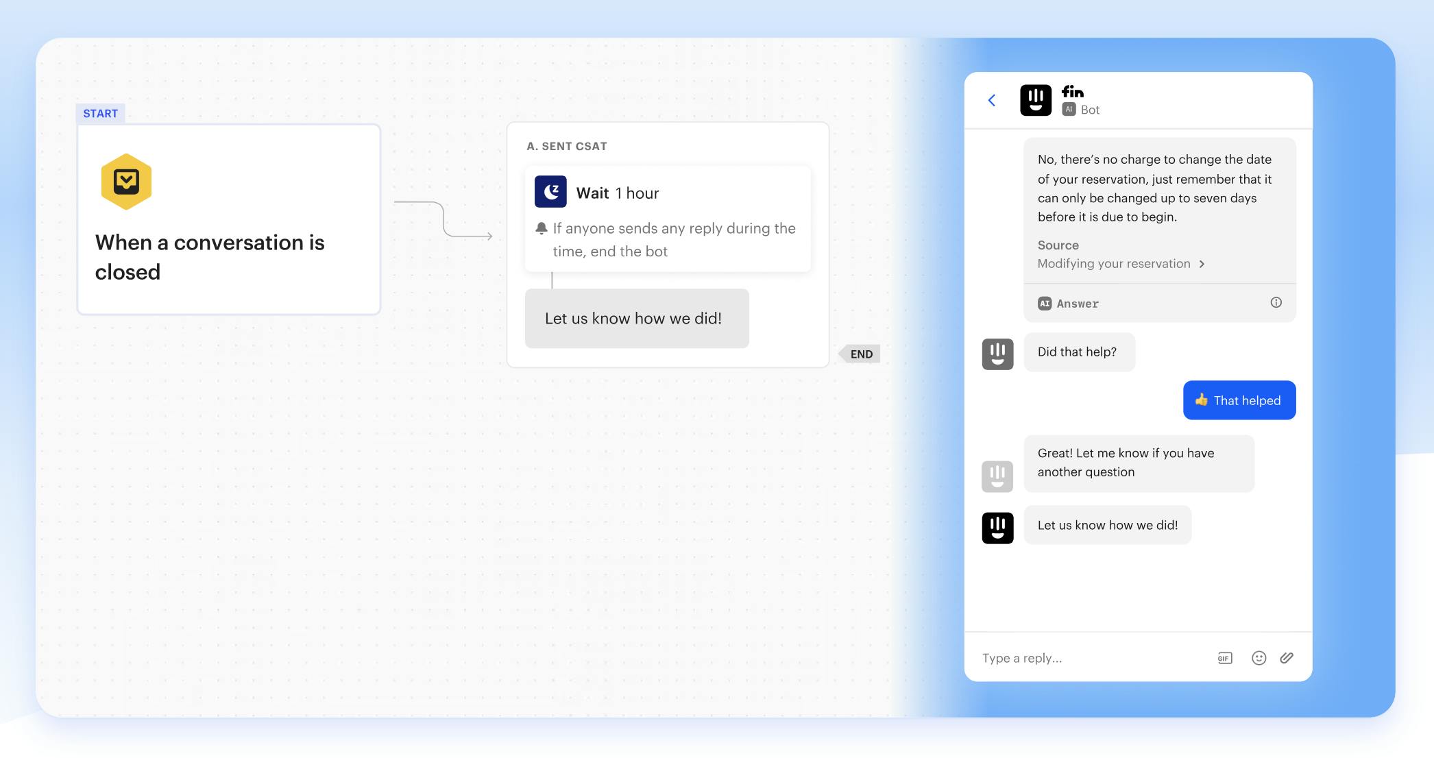 A support team can customize the bots' design and manually creates each intent and workflow. Intercom’s custom bots were a precursor to Fin, since the design process, although no-code, requires manually mapping out as many user interactions and intents as possible. Still, Intercom’s custom bots continue to support more rigid customer journeys, like lead generation, or basic help desk redirection.