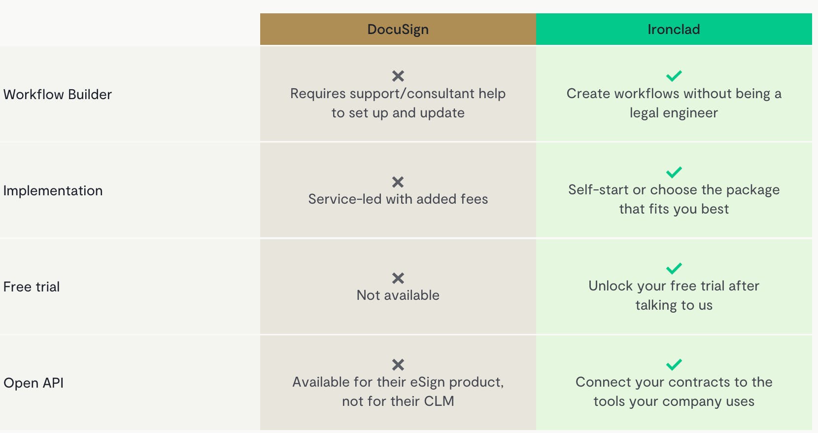 This difference comes down to the integrability of products — according to Ironclad CEO Jason Boehmig, “Ironclad offers a more integrated variety of contracting tools, while DocuSign's tools are a little more fragmented”. Ironclad purports to provide more flexibility and customization when it comes to editing and creating workflows, as well as leveraging more open APIs than DocuSign.