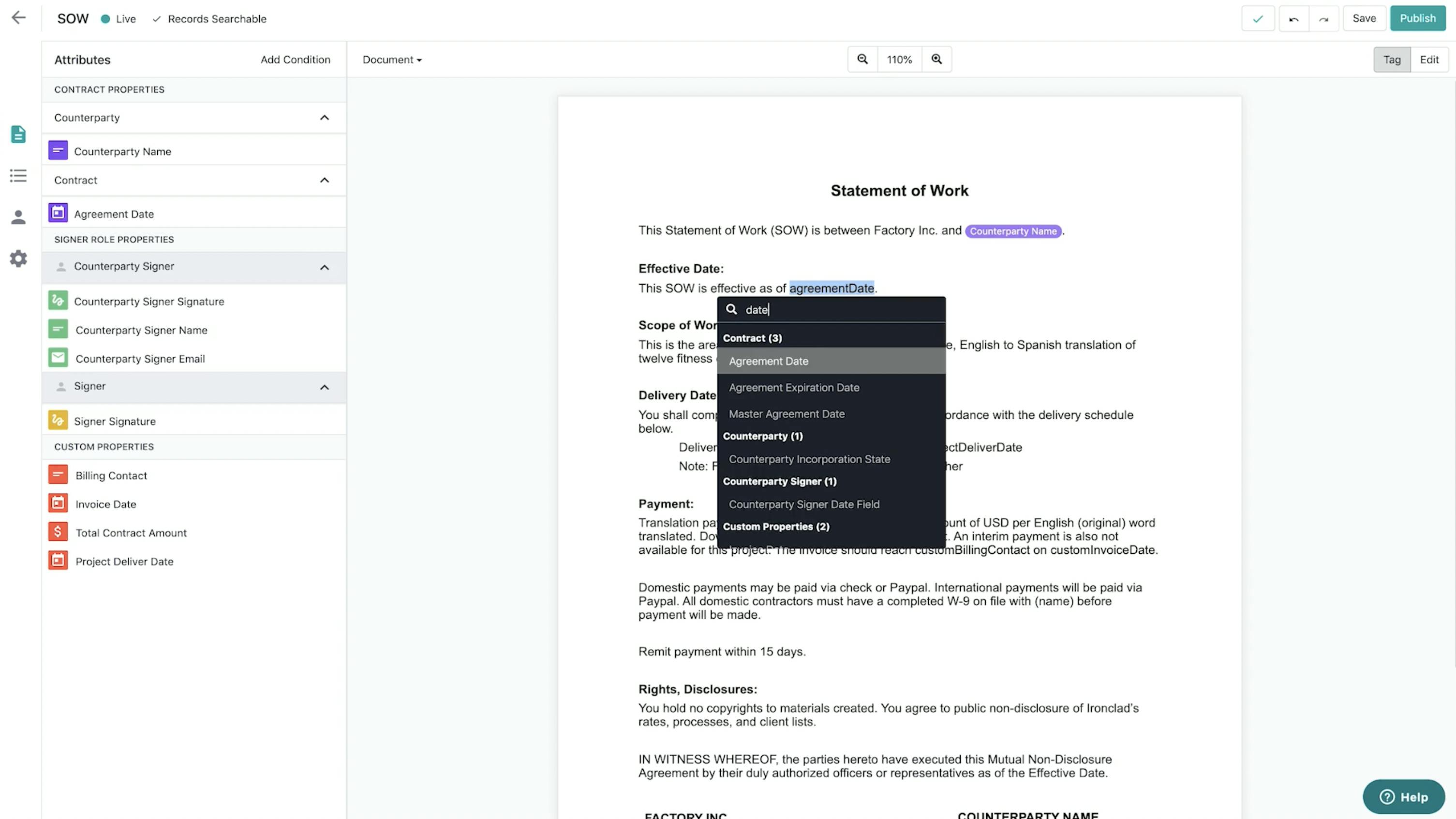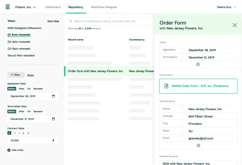 Because the average Fortune 2000 company is managing 20-40K contracts, it can be difficult to keep track of every clause and counterparty. Ironclad’s contract repository helps to store a customer’s contracts and makes navigating them more simple. For example, the repository offers a snapshot of a contract’s metadata in viewing mode, allows for advanced filtering by specific dates and terms, and lets users sort them by specific characteristics.