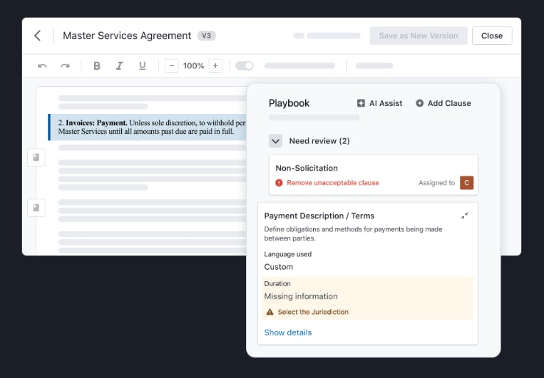 Ironclad’s editing module is similar to Google Docs in functionality where users can collaborate on specific sections of a contract, leave comments, review different versions, and assign each other responsibilities in the creation process for a contract.
