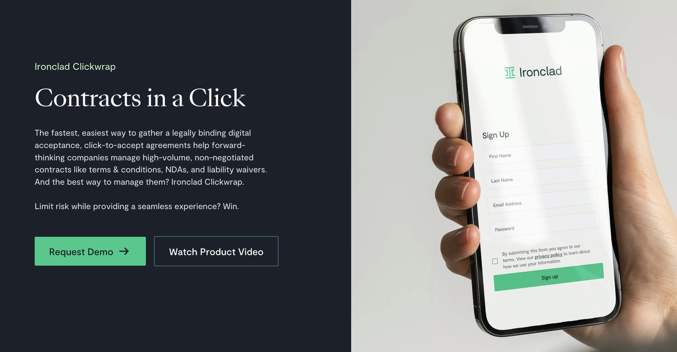 In addition to its core CLM product suite, Ironclad also has a product called Clickwrap specifically designed for embedding legal agreements online. Clickwrap enables customers to interact with the right contract at the right time, without having to manage documents, instead signing contracts like NDAs right in a customer’s digital interface.