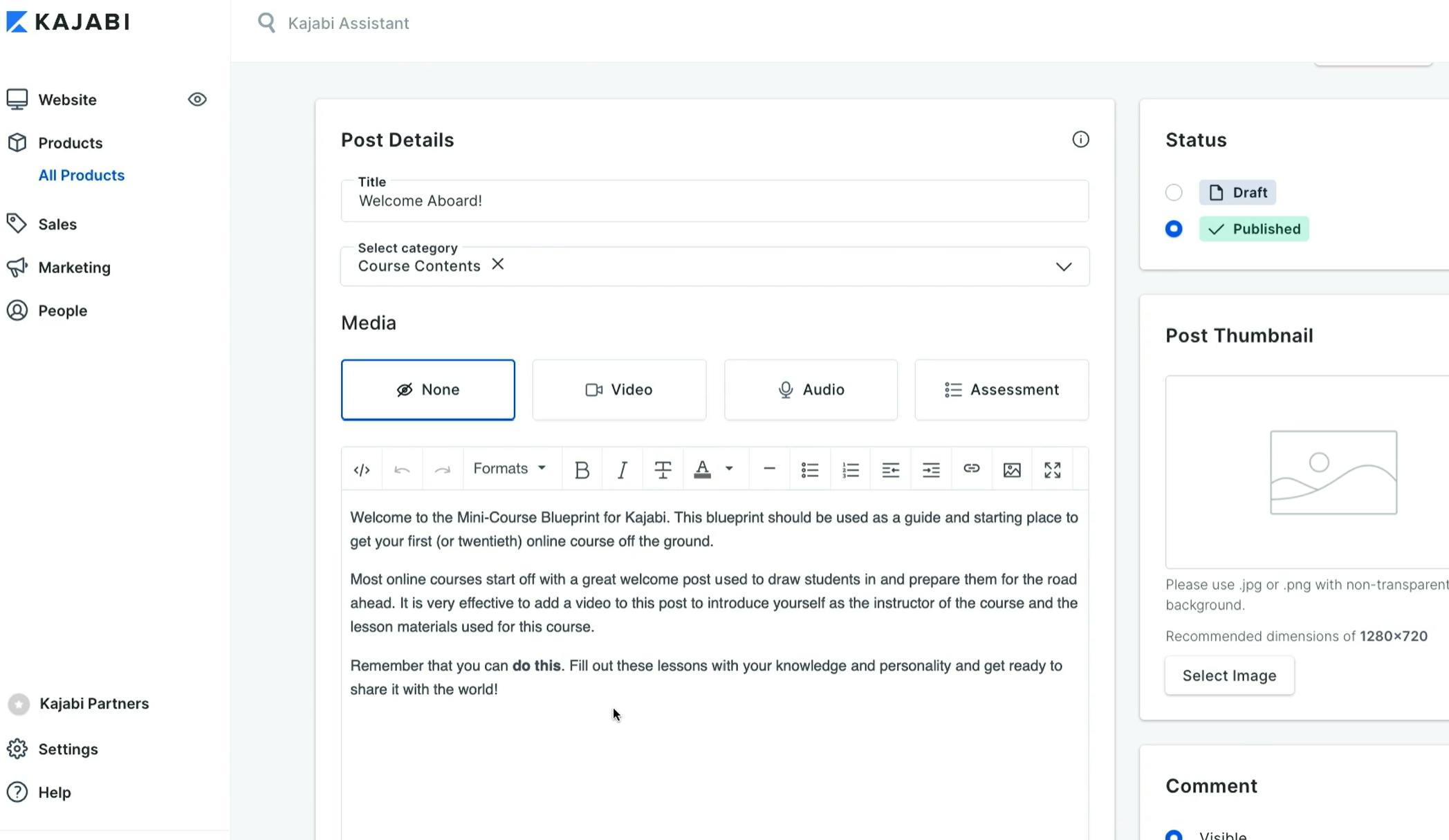 For online courses, users create modules in order to place their videos and organize lessons. Kajabi offers templates for designs that cater to creators in different niches. Users can add text descriptions, audio, assessments, and downloadable files within each module.