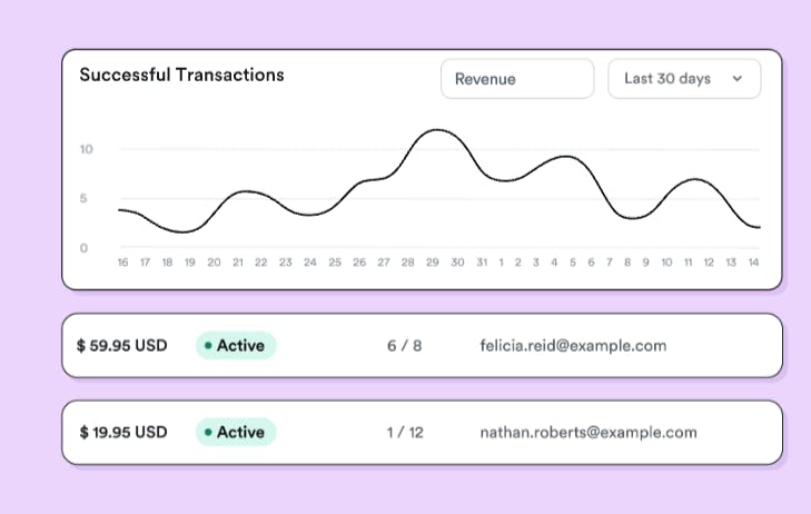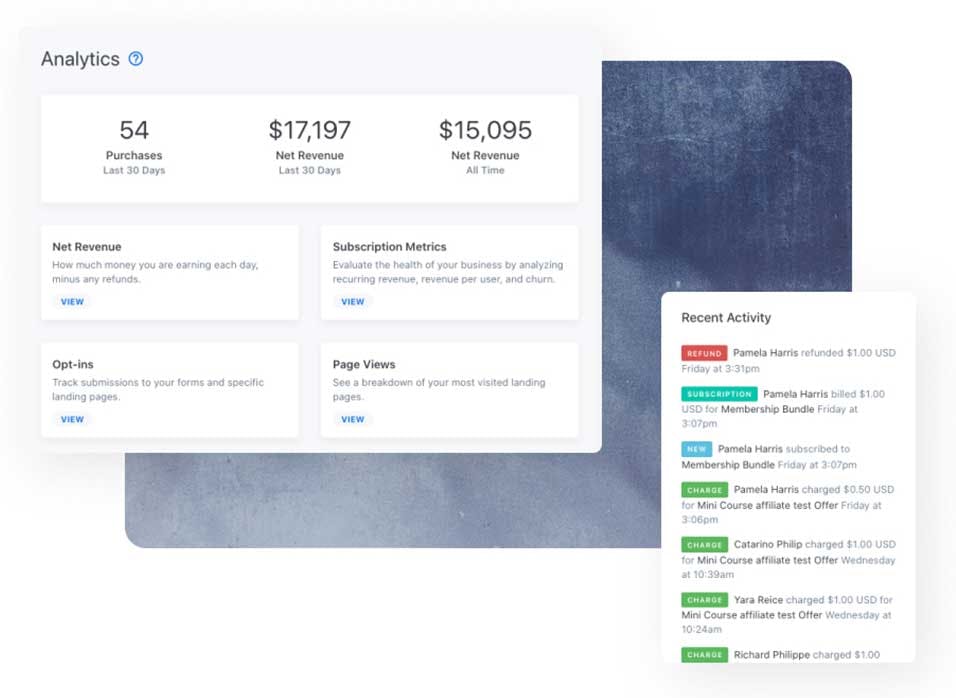 Kajabi's Analytics feature provides a comprehensive dashboard that organizes key metrics for a creator’s business, such as revenue, offers sold, and subscription performance. It offers in-depth reports on customer behavior, product performance, and website or page analytics, allowing creators to optimize content and improve customer engagement.