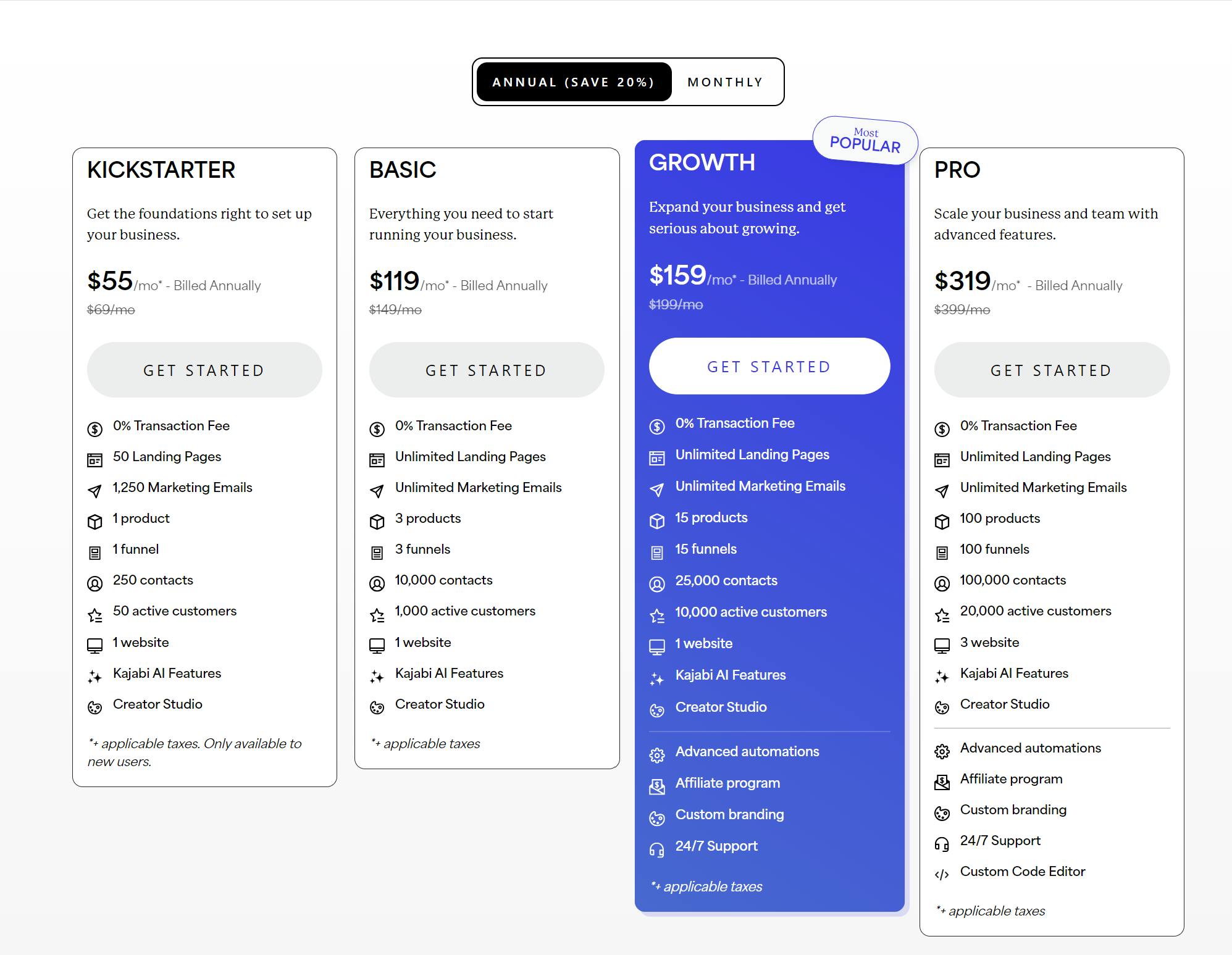 Kajabi’s Pro Plan costs $319/month and is used once creators are operating at a large scale. It increases the amount of products, funnels, contacts, active customers, and websites. It also includes a custom code editor allowing for greater customization.