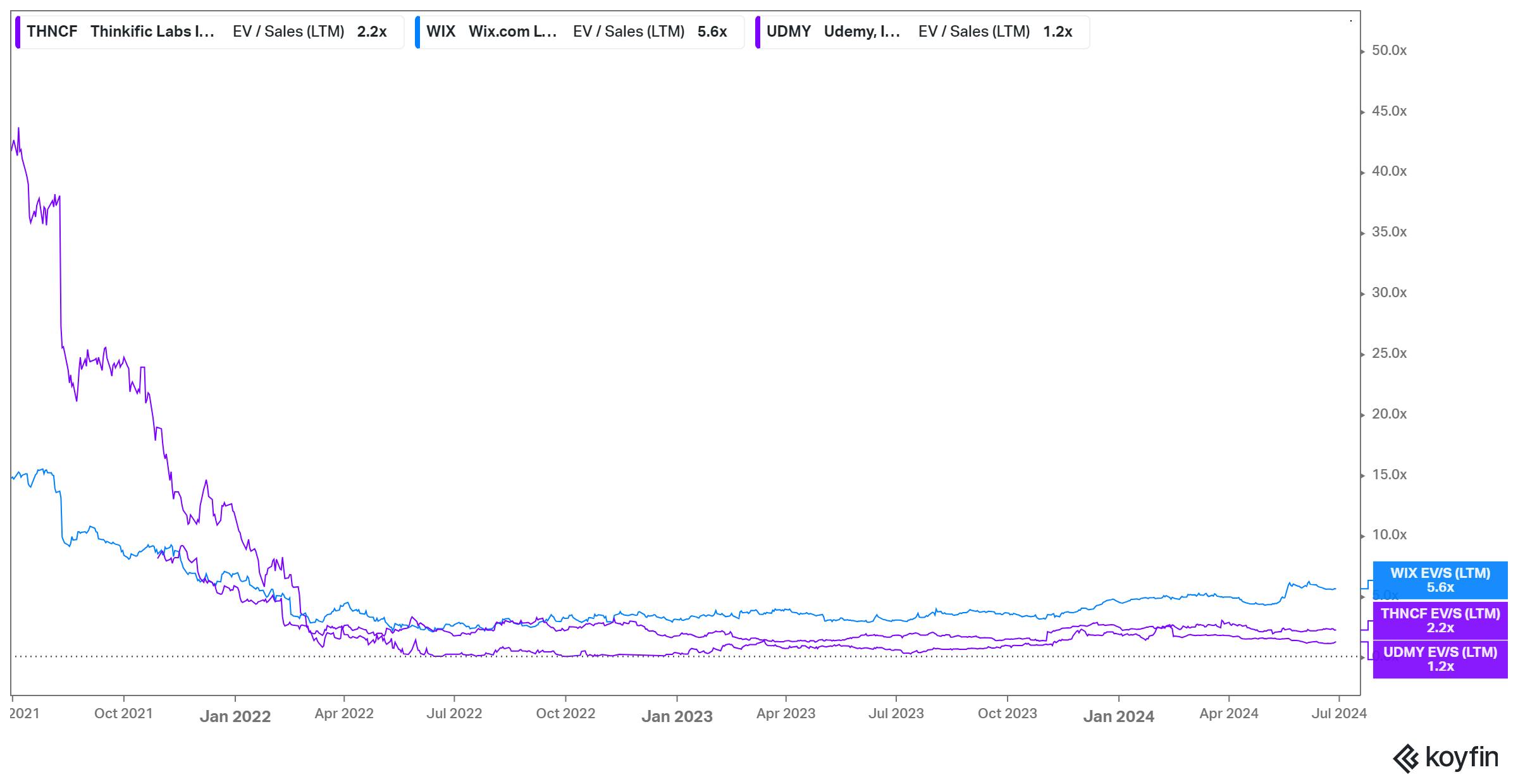 Publicly traded companies most comparable to Kajabi include Thinkific, Udemy, Wix, and Squarespace. Thinkific, Udemy, and Wix have all seen their revenue multiples decline to between 1-6x in July 2024 from a high of between 15-40x in 2021.