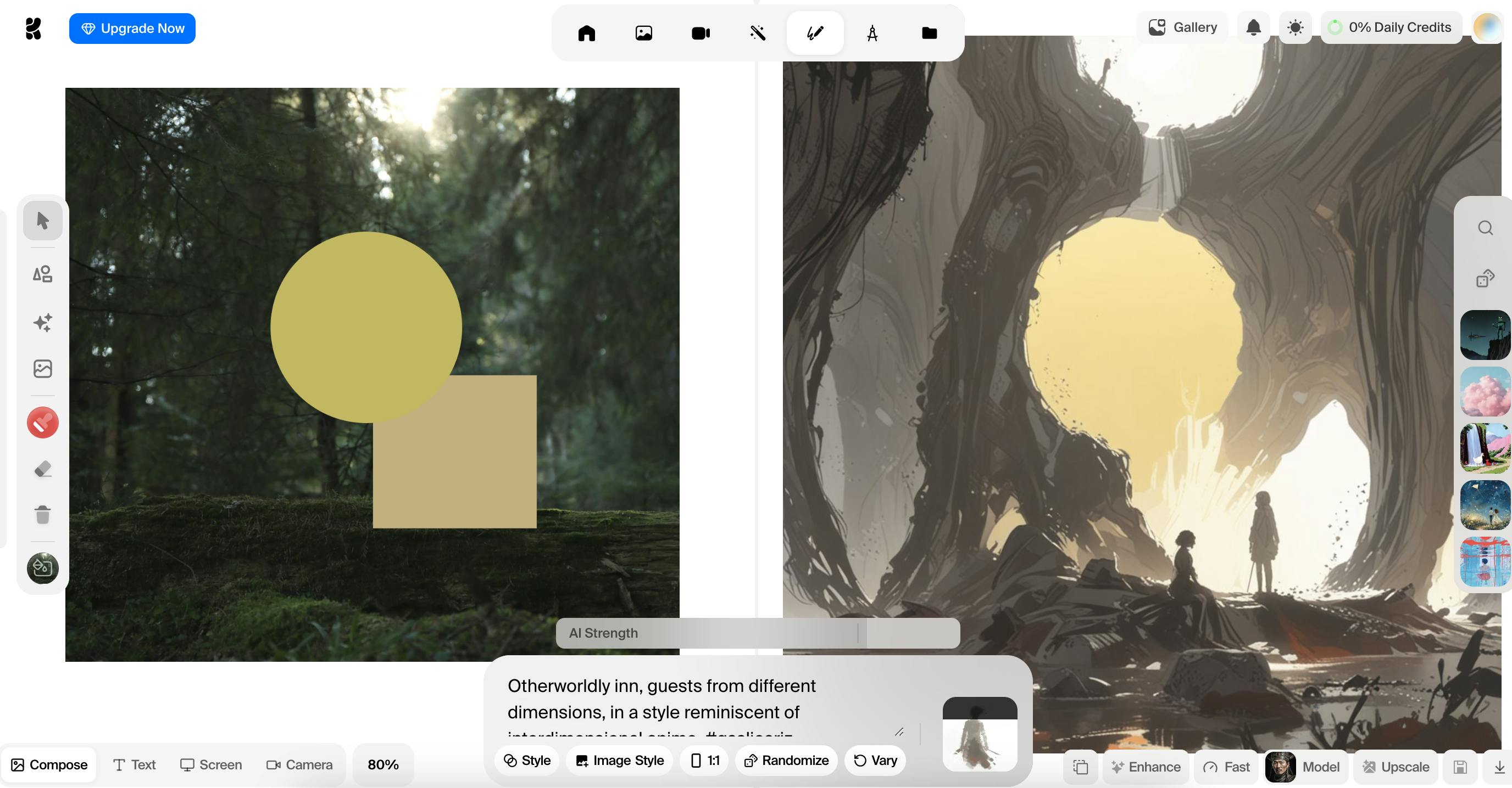 Meanwhile, Krea’s real-time editing tool provides real-time AI image generation capabilities and a novel user interface in a real-time AI rendering on a canvas. Users can interact with the AI through a split-screen interface: on one side, users can draw, sketch, or manipulate shapes and layouts; on the other, the AI-generated output updates instantly in response to these changes and to text prompts. This immediate feedback loop allows creators to make immediate adjustments to their designs, such as inserting shapes or changing object positions, which are then reflected in the AI-generated image in real-time.