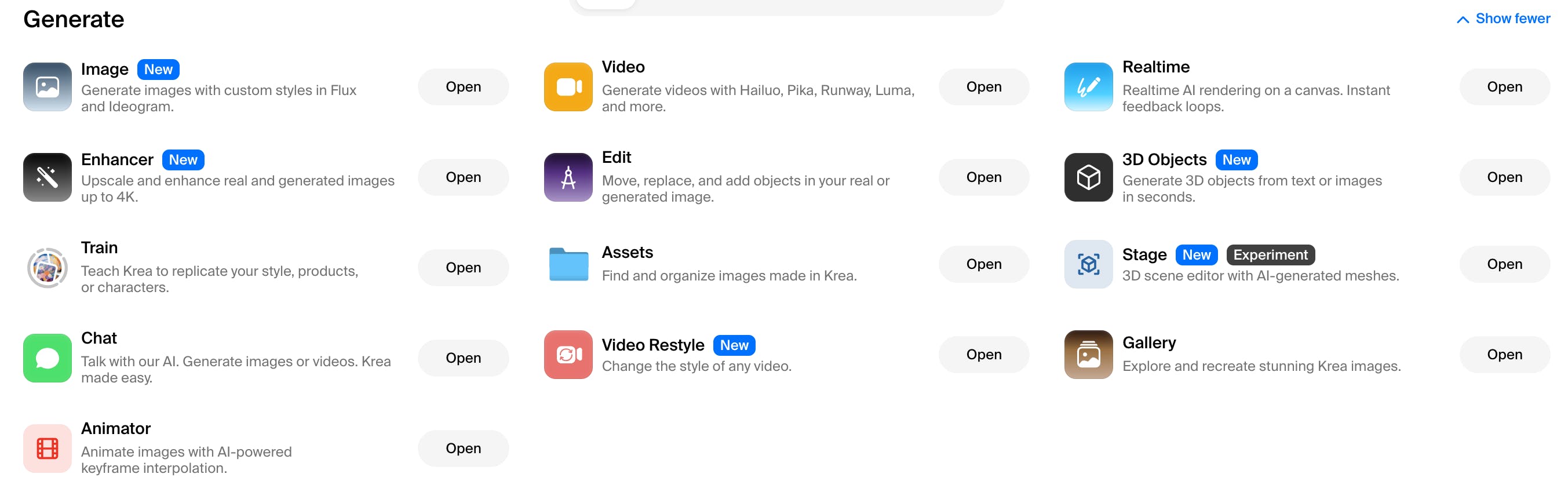 Krea provides a simple browser-based user interface requiring no installation or technical setup. Krea AI operates by allowing users to train AI (using text, image, videos, etc) on their distinctive styles, subsequently generating visuals (images, videos, 3D models). Users can select from a group of tools to start creations.