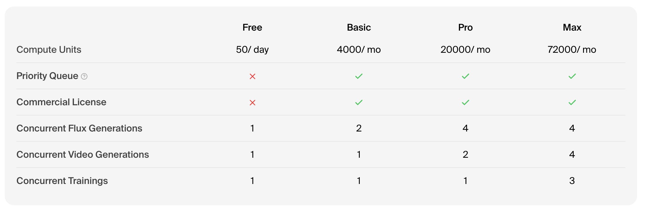 The individual subscription model follows freemium pricing plans. Krea offers four different levels of plans for personal use, ranging from free to $80 per month ($64 per month for yearly subscriptions). The usage is calculated by compute units, which are a measure of computational resources used to generate images or videos. Different tasks consume varying amounts of compute units based on their complexity and output quality. For example, generating a high-resolution image or a longer video will use more compute units than a smaller image or a shorter video.