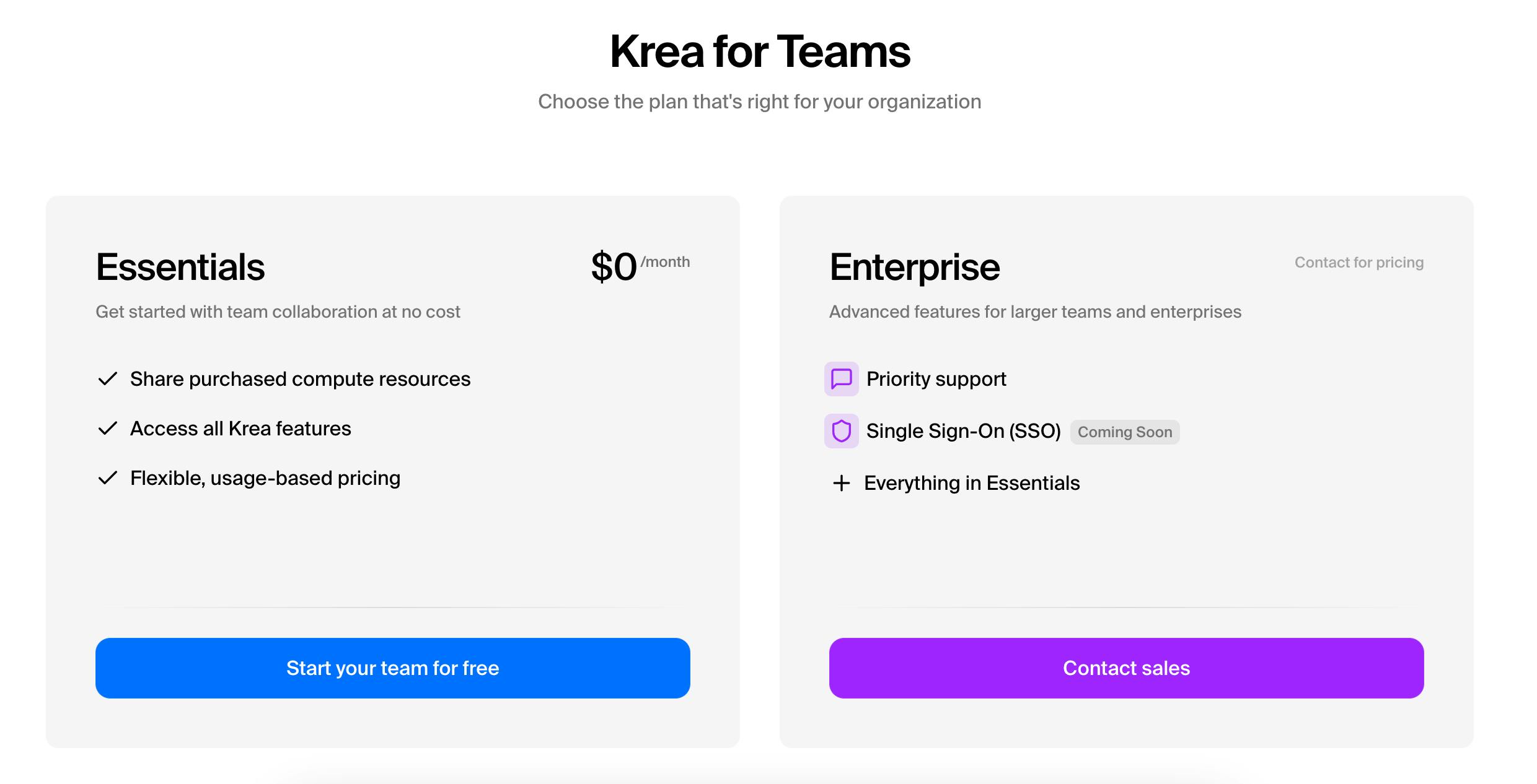 Krea for Teams is Krea’s enterprise plan. Krea provides a free team collaboration setup and enterprise plan pricing based on team sizes and advanced features.
