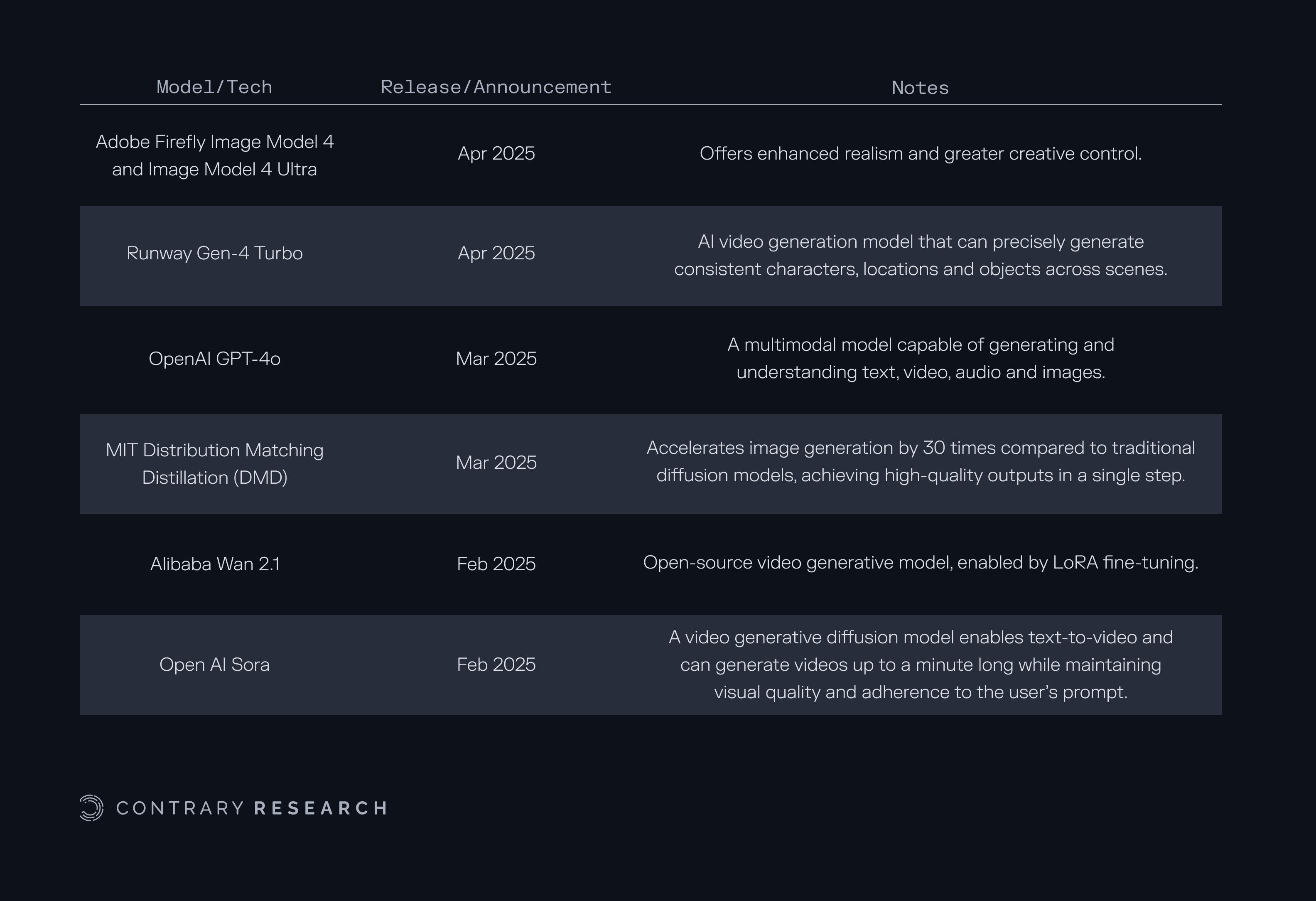 At the same time, breakthroughs in model architecture are unlocking new creative capabilities. Latent consistency models (LCMs) and techniques like Flux have reduced image generation latency from minutes to seconds, while foundation models such as Sora (OpenAI), Veo (Google), and Gen-3/4 (Runway) are enabling real-time, high-fidelity video generation with controllable motion and style. Industry analysts expect this pace of model innovation to continue on a six-12 month cycle, further accelerating the adoption of AI-powered creative workflows.
