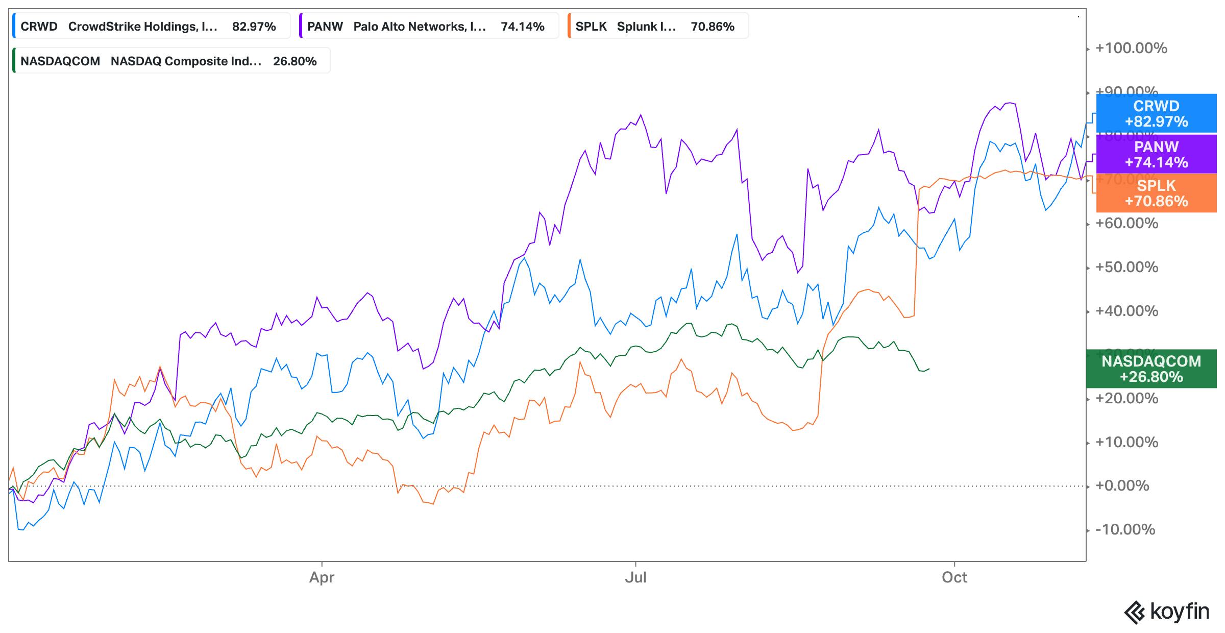 During the first half of 2023, publicly traded cybersecurity companies held up fairly well in comparison to other enterprise software categories. As of November 2023, the NASDAQ was up 26.8% YTD but companies with exposure to cloud security such as Palo Alto Networks, Crowdstrike, and Splunk have risen 74.1%, 82.9%, and 70.8% respectively.