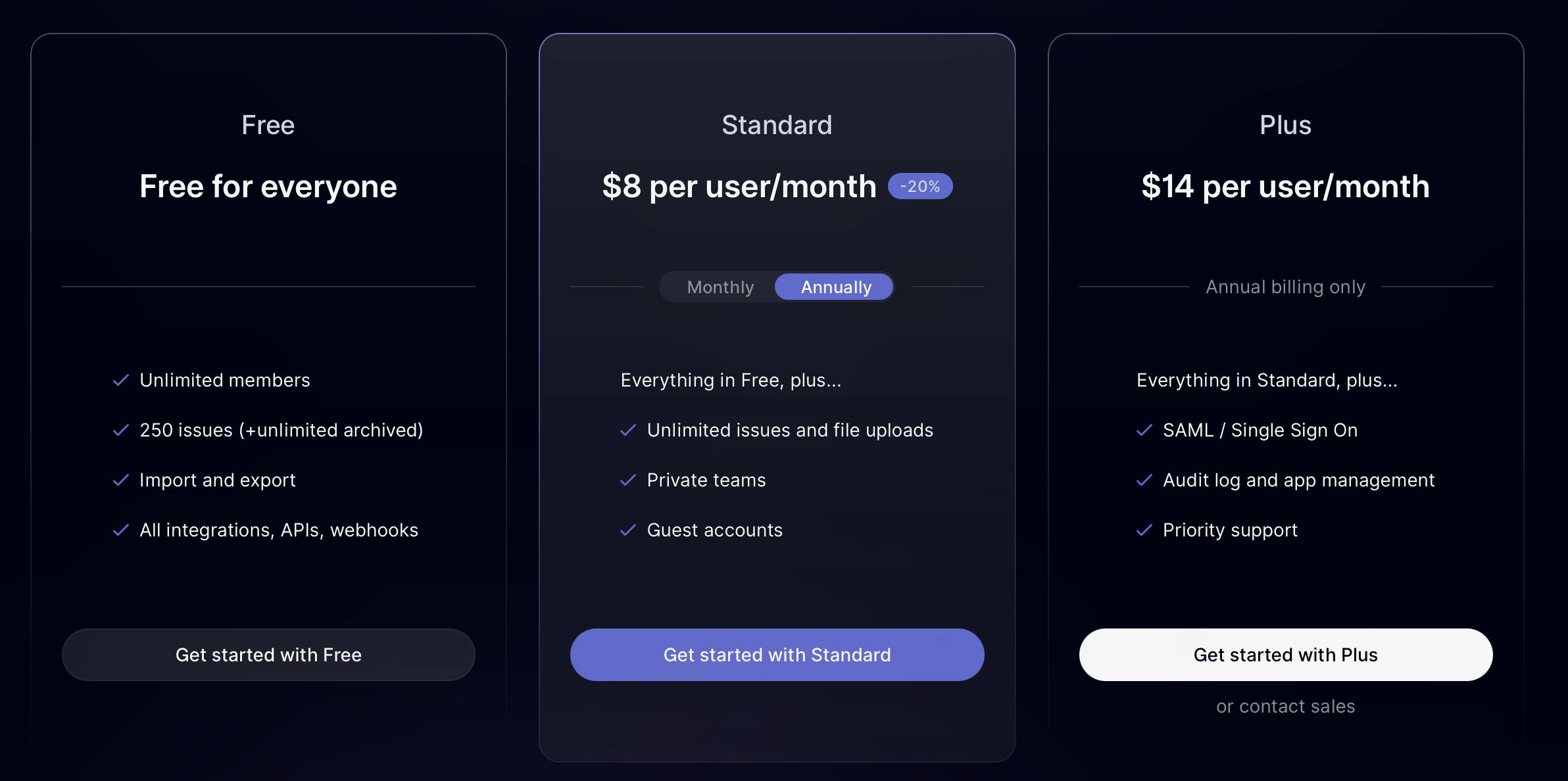 Linear has a freemium SaaS business model with Free, Standard, and Plus tiers.