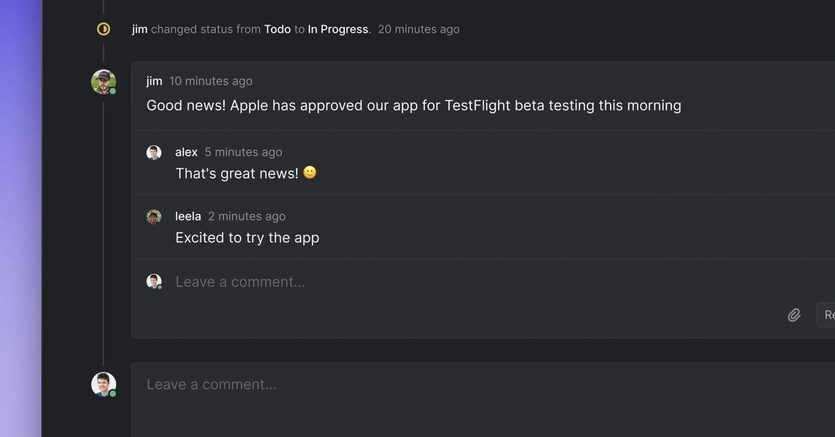 Within an issue, the notes and comments sections support flexible interactions. Comments support full Markdown editing, attachments, comment threading and reacting with emojis so that users can follow the different aspects of an issues progress more speedily.