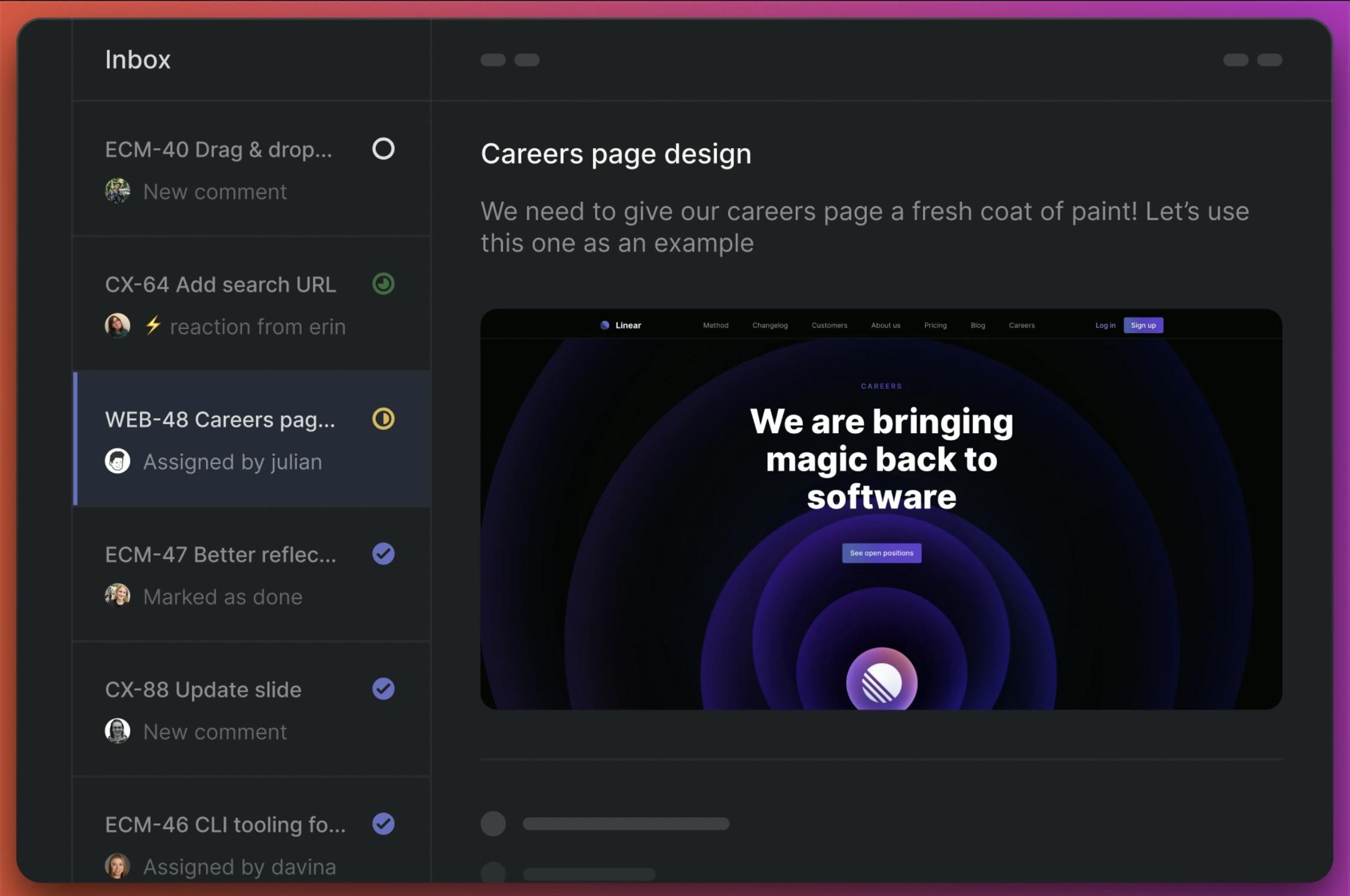 Linear is designed around the Linear Method, a set of principles that the company believes helps to create high-quality software, including saying no to busy work and starting simple before growing over time.