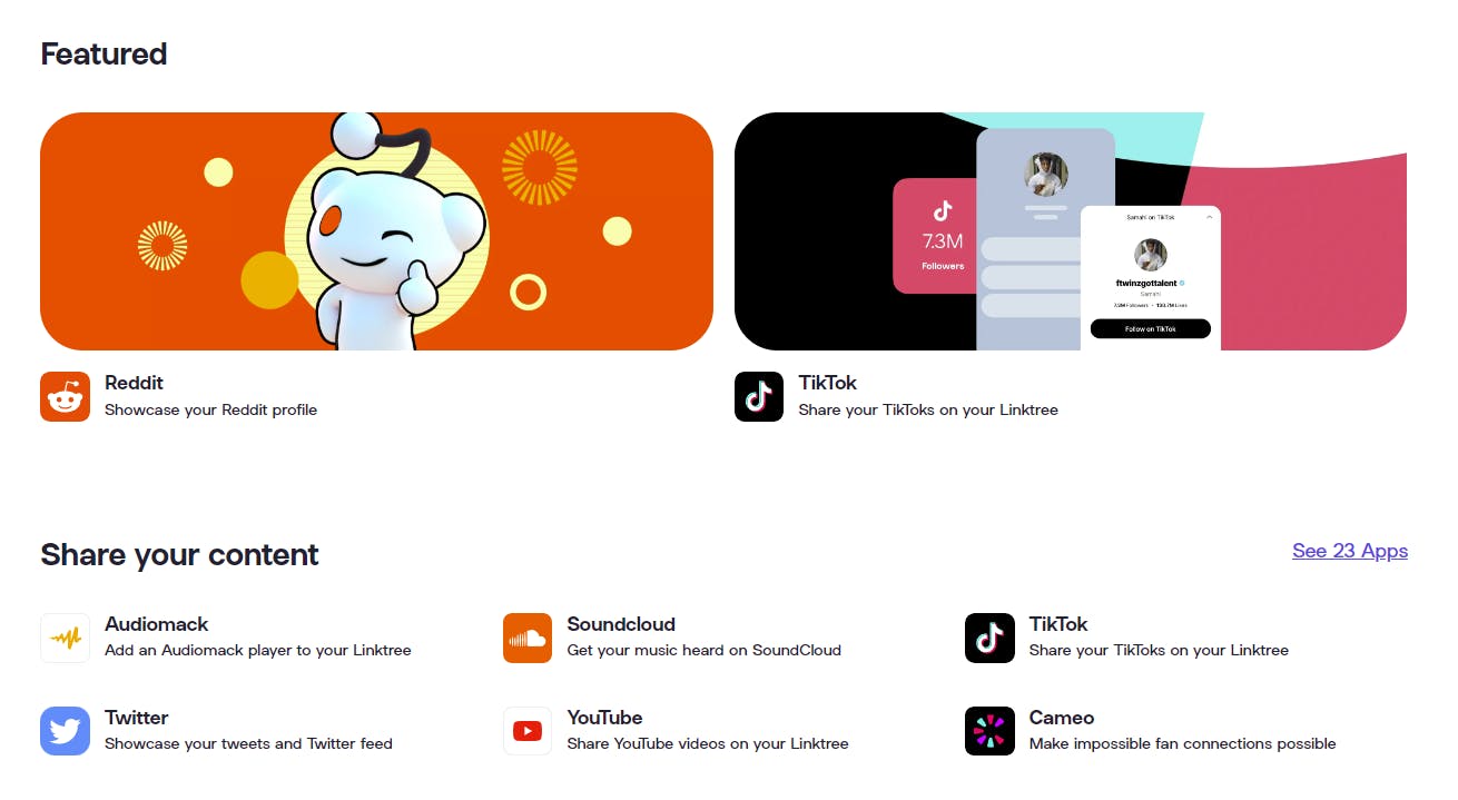 Linktree Marketplace is a hub where creators can discover and access tools and integrations that can be included in their Linktree page to amplify their online presence. With 39 apps and six integrations spanning categories like media, ecommerce, fundraising, and payments, users can offer services directly from their Linktree page. These integrations allow users to enable visitors to interact with content, services, or platforms without redirecting them to an external website or app.