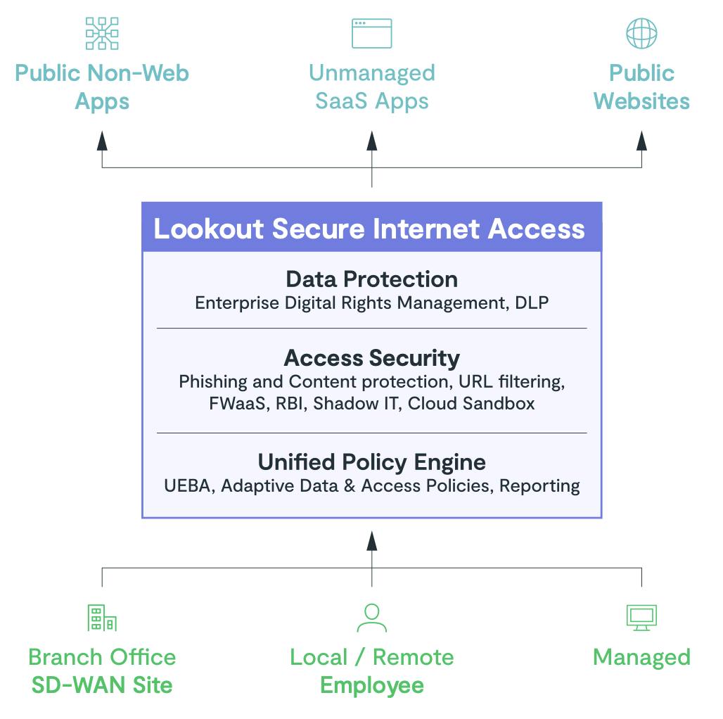 Secure Internet Access (SWG): Lookout’s Secure Internet Access is a cloud-delivered SWG. It protects users, networks, and data from internet-based threats while preventing data leakage. Built on zero trust principles, it offers a single-proxy architecture with inline and API security controls. It inspects all web traffic for malicious content and sensitive data, simplifying IT operations.