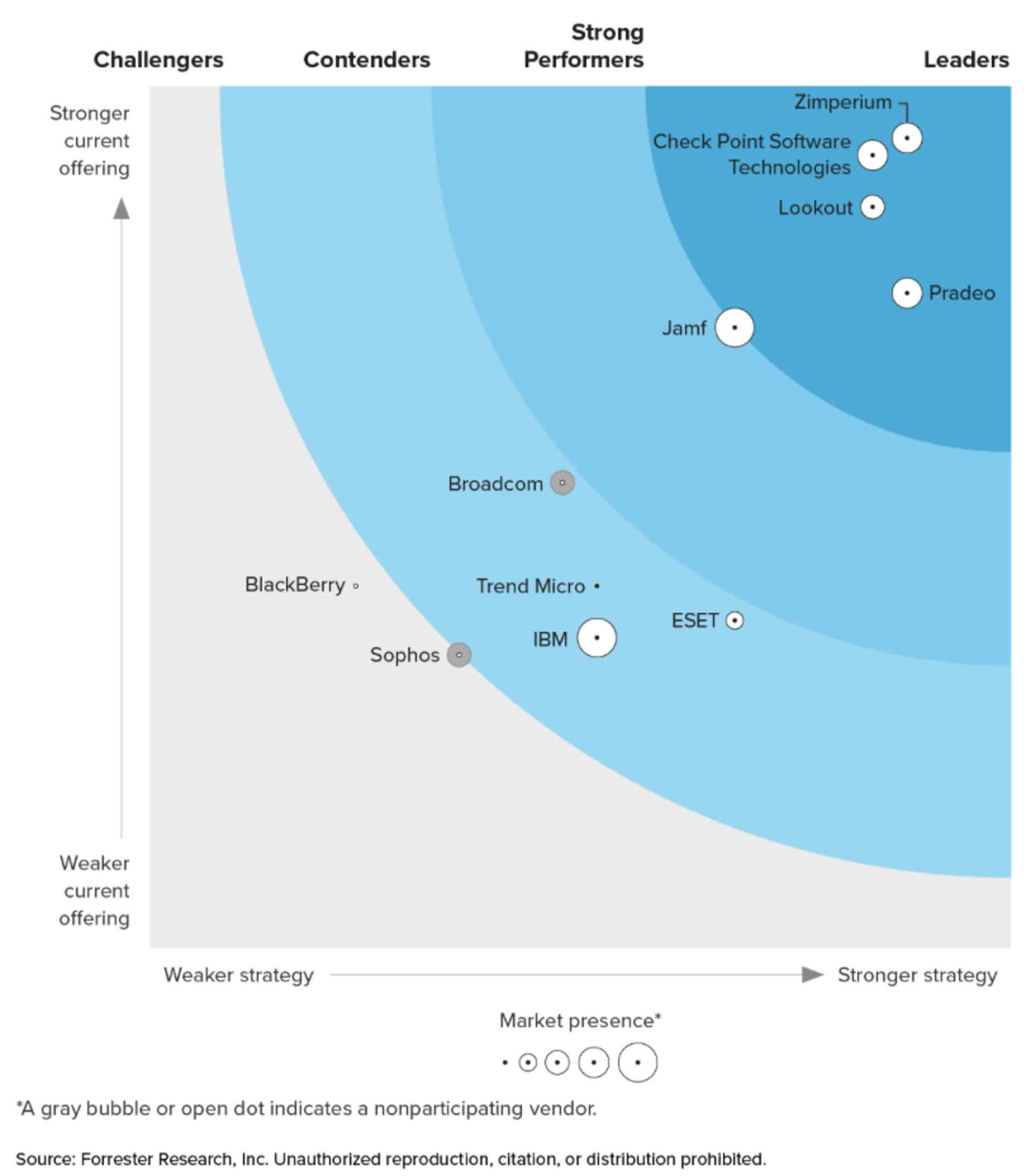 Zimperium: Zimperium’s Mobile Threat Defense product focuses on four threat categories: device compromises, network attacks, phishing and content, and malicious apps. Similar to Lookout’s Threat Intelligence product, Zimperium’s z3A feature focused on advanced-app analysis. According to a Forrester report, it outperforms Lookout in its offering and has a stronger market presence as of 2024. Founded in 2010, Zimperium raised $72 million before Liberty Strategic Capital acquired a majority stake for $525 million in March 2022.