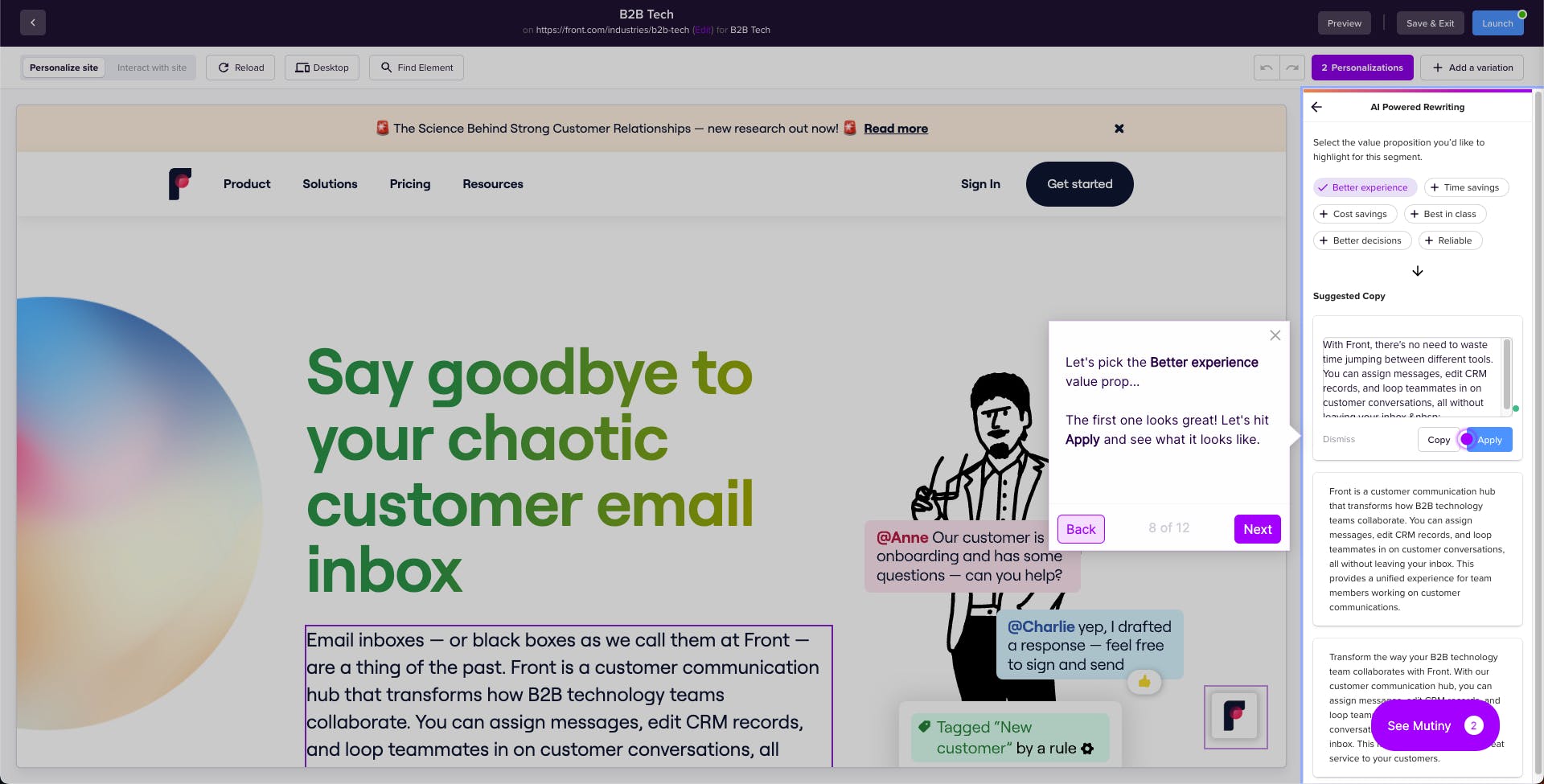 For marketers, it’s often necessary to be able to quickly make changes to a website, but many marketers lack the technical skills needed. Mutiny's no-code editor empowers B2B marketers to easily make website changes without designer and developer support and helps measure results.