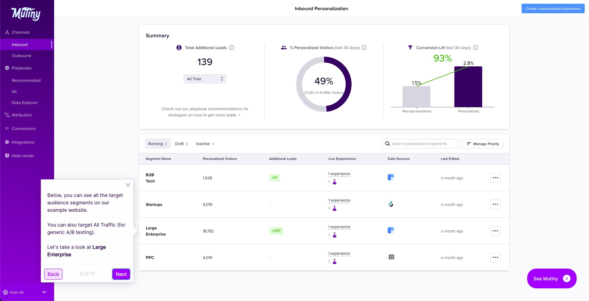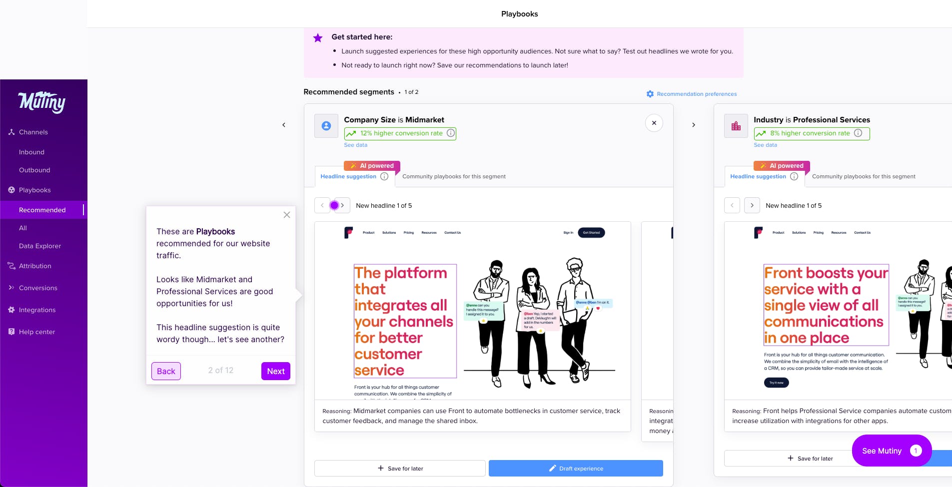 Mutiny also has a library of recommended best practices called Playbooks. These best practices are based on machine learning and human expertise and are meant to help companies prioritize marketing efforts to drive results per business’s needs. Mutiny’s Playbooks are continually updated as Mutiny grows its data platform.