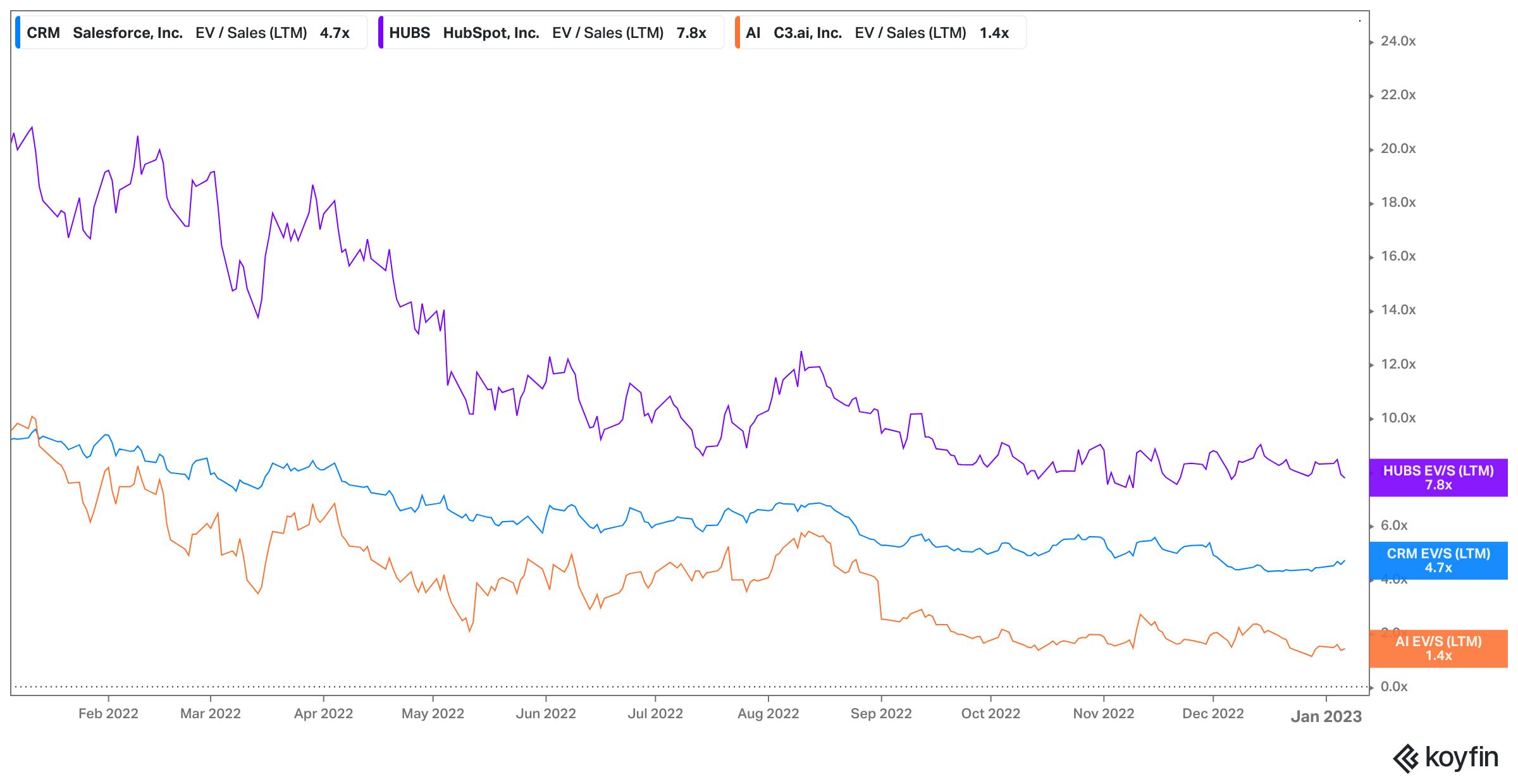 For comparison, in the public markets, valuations for sales and marketing, no-code, and AI companies have fallen from the beginning to the end of 2022. For example, HubSpot traded at ~20x LTM revenue in January 2022 before seeing that multiple fall to ~8x LTM revenue in December 2022.